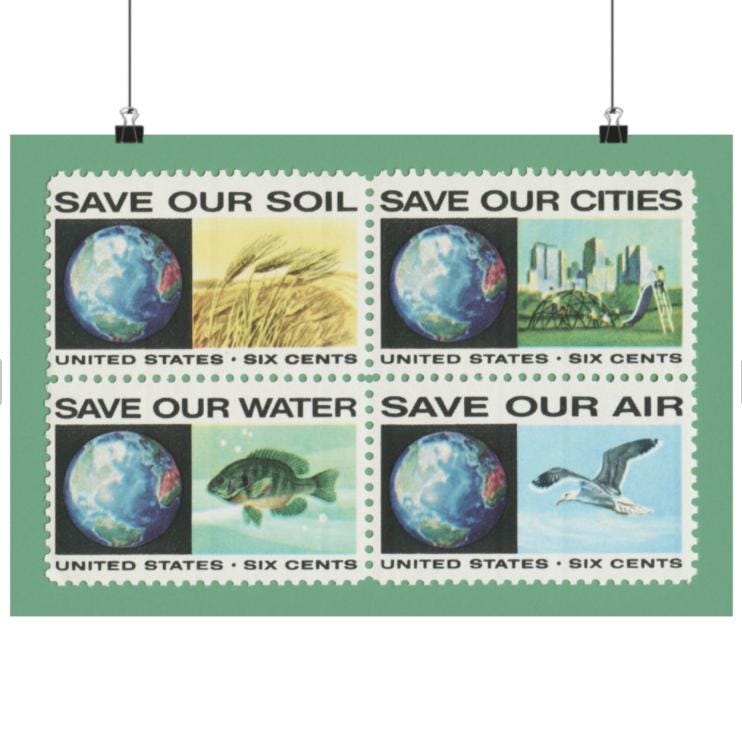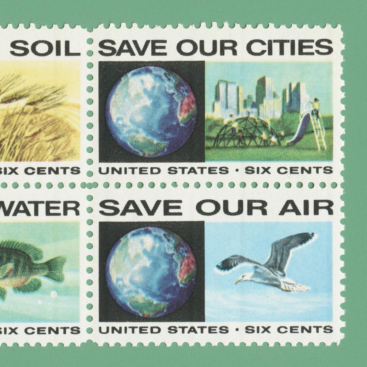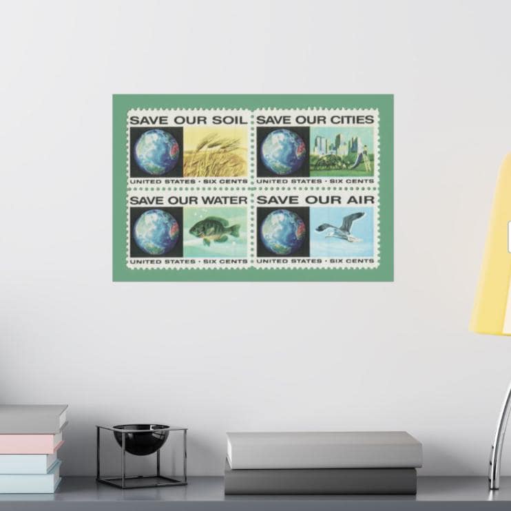 All four stamps featured here were issued as part of a "Anti Pollution" campaign that debuted in 1970. Add a piece of history from a bygone era with this thoughtfully crafted vintage stamp art print.