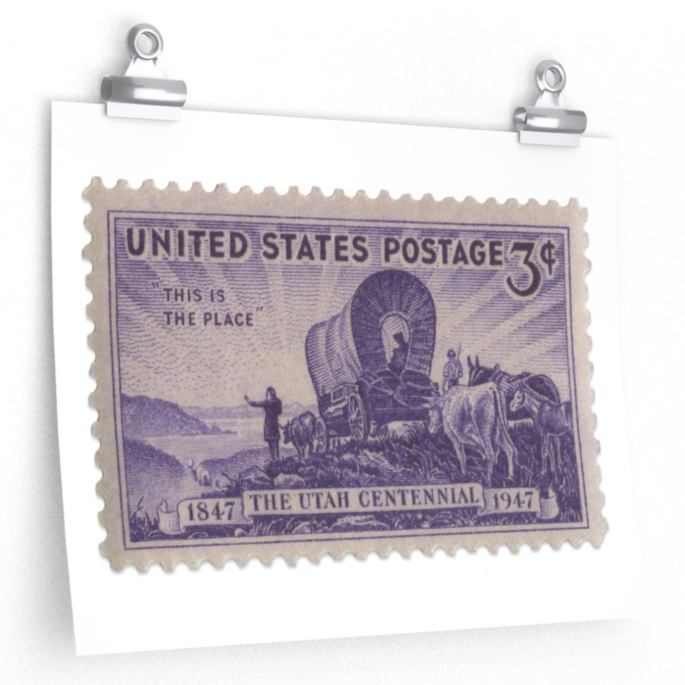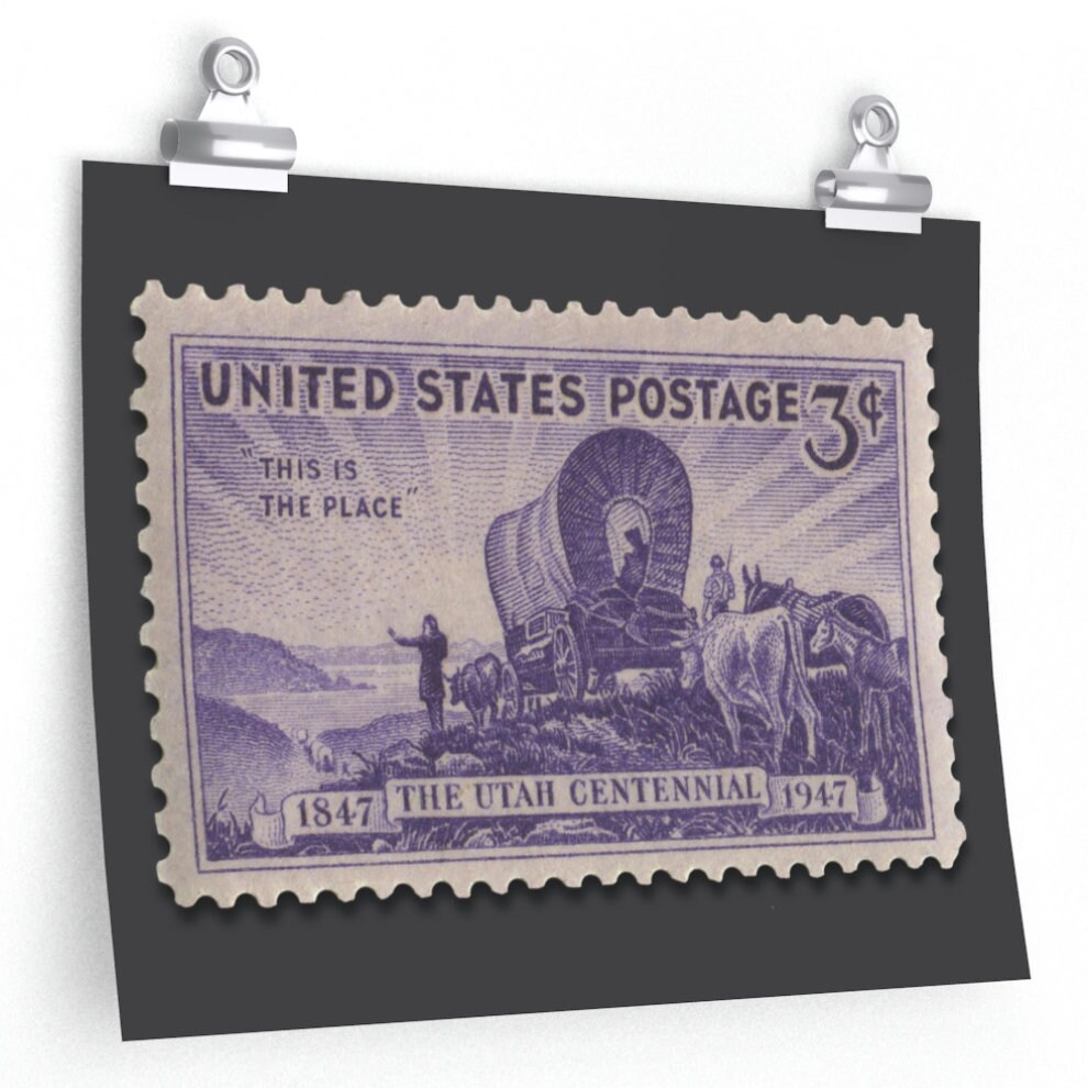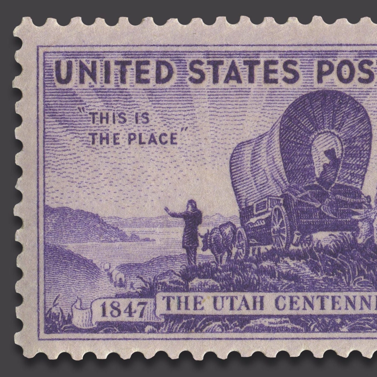 The stamp commemorates 100 years since Brigham Young and the Mormon pioneers arrived in the Salt Lake Valley on July 24, 1847, celebrating the sacrifice the Mormon settlers made by trekking across the plains.