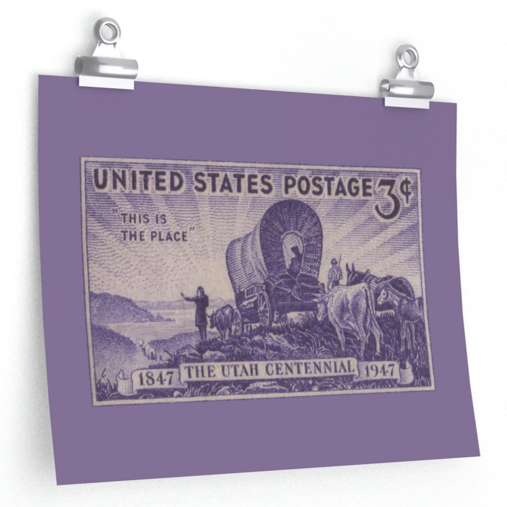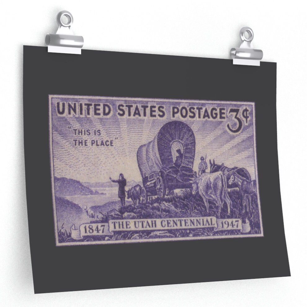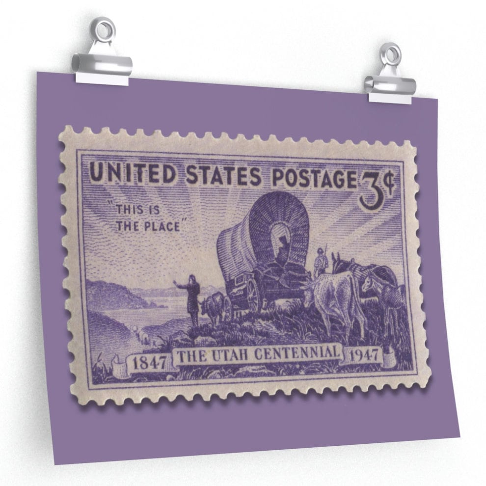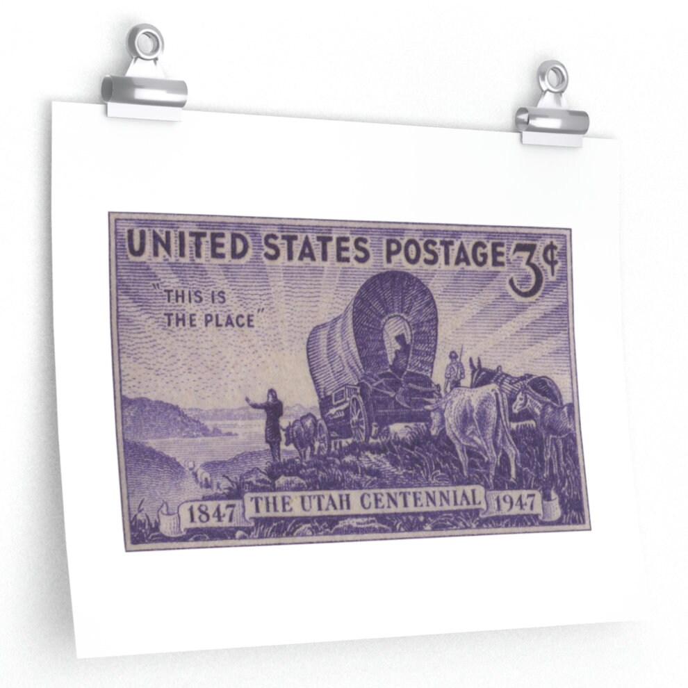 The stamp commemorates 100 years since Brigham Young and the Mormon pioneers arrived in the Salt Lake Valley on July 24, 1847, celebrating the sacrifice the Mormon settlers made by trekking across the plains.