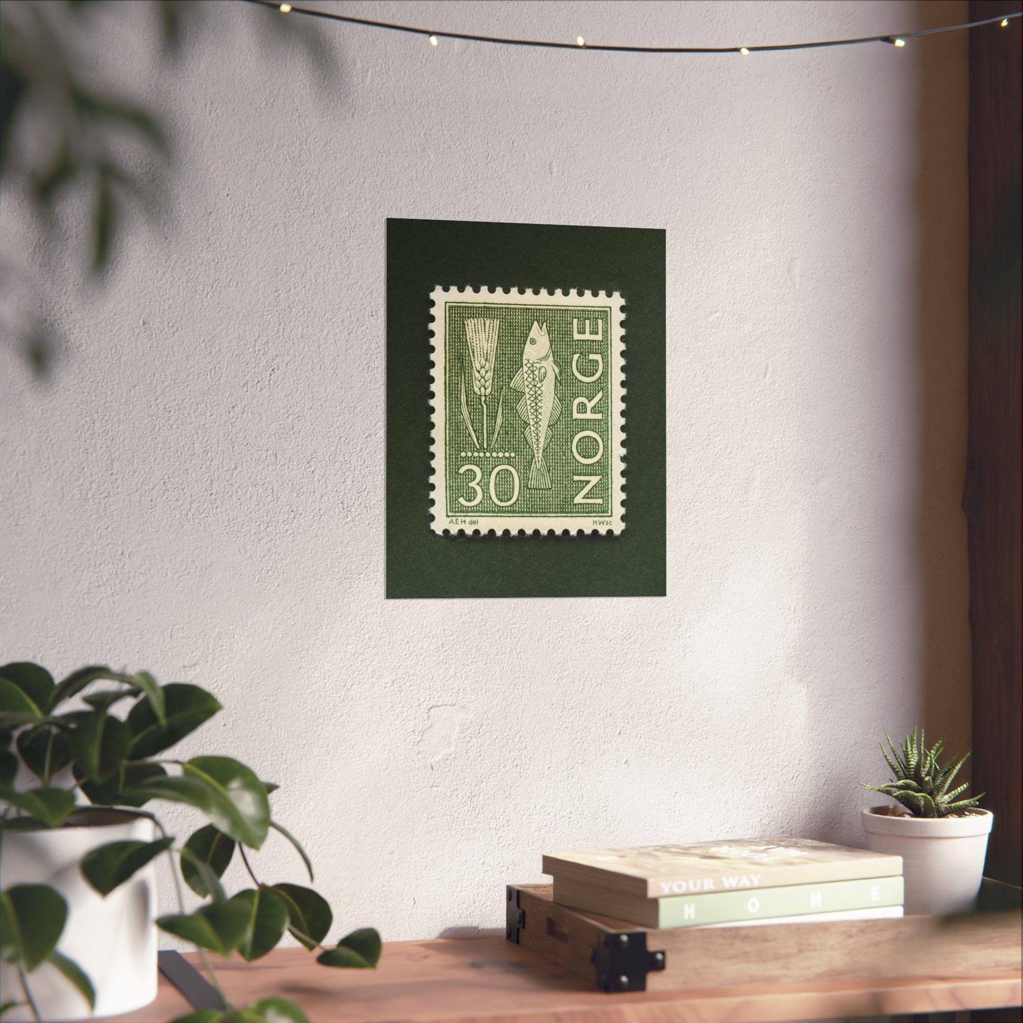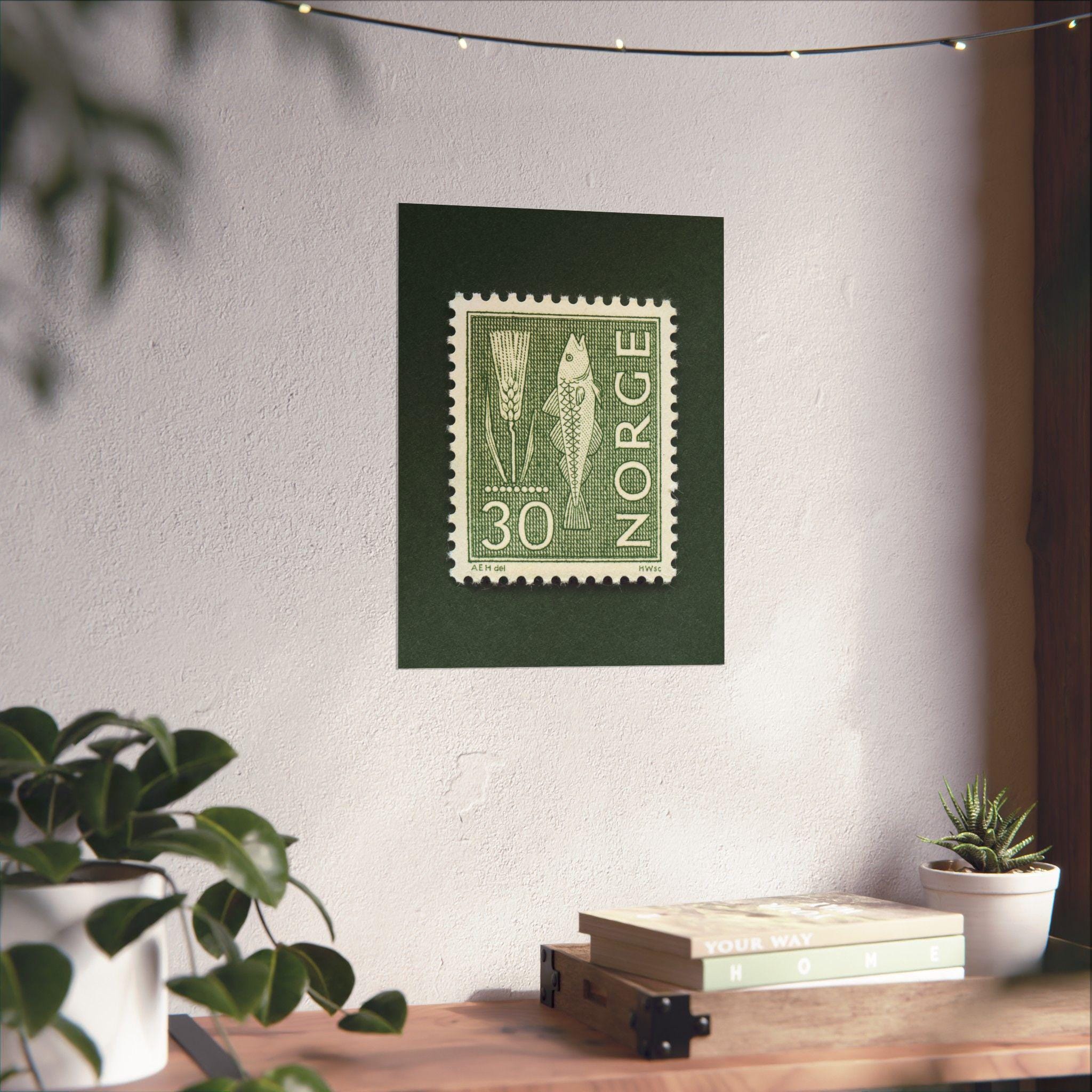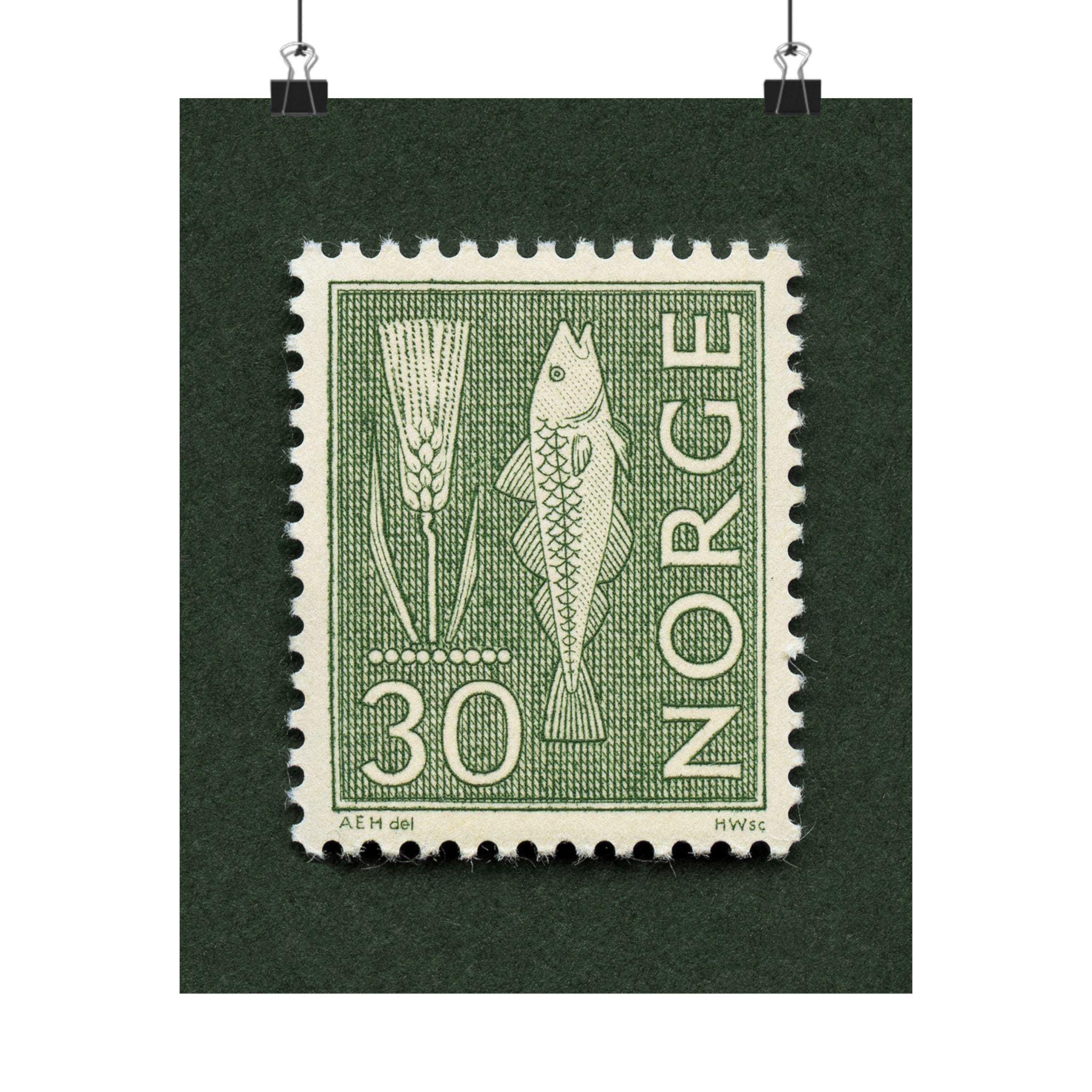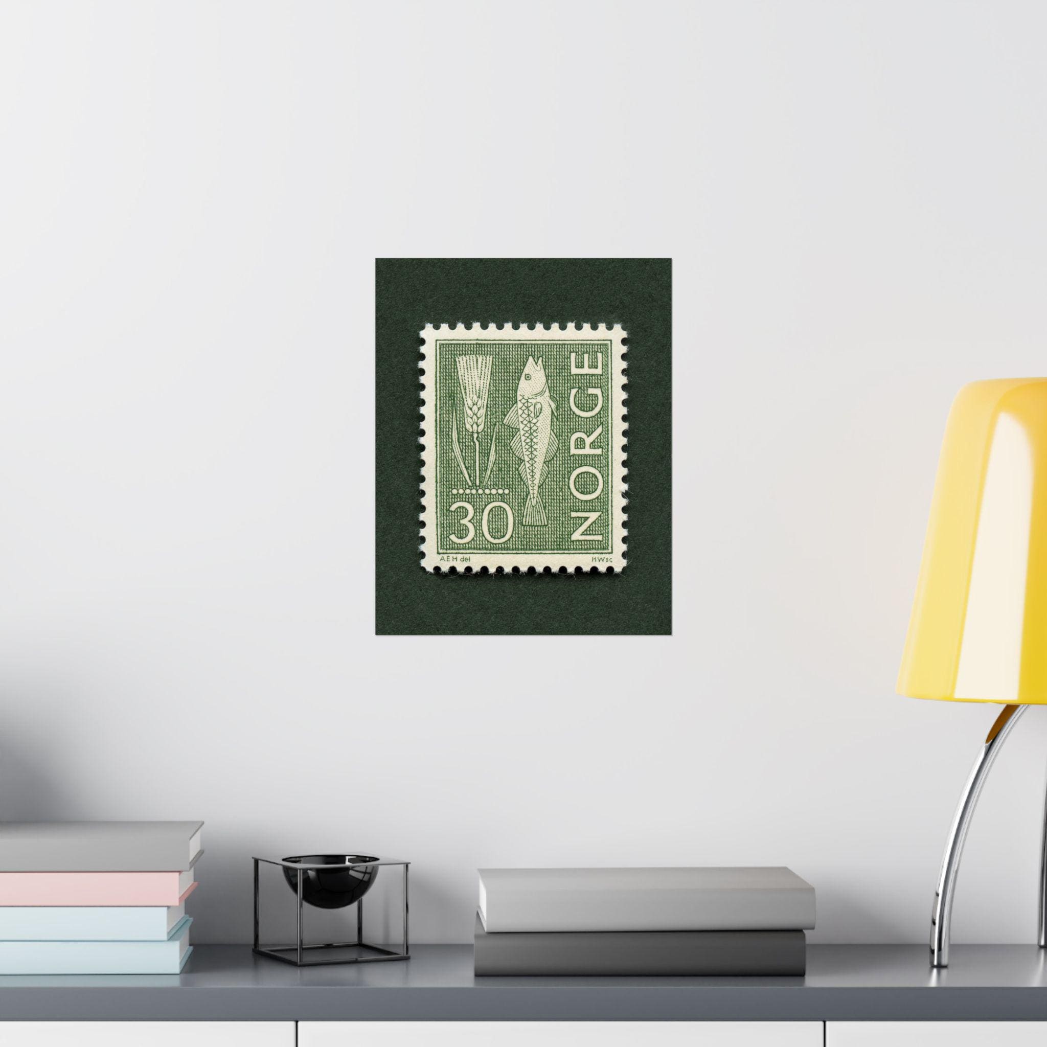 Beautiful monochromatic stamp from Norway featuring a fish and rye. Add a piece of historic Norway with this this thoughtfully crafted vintage stamp art print. Please note, the stamp is one single print with a natural drop shadow as part of the scanning process.