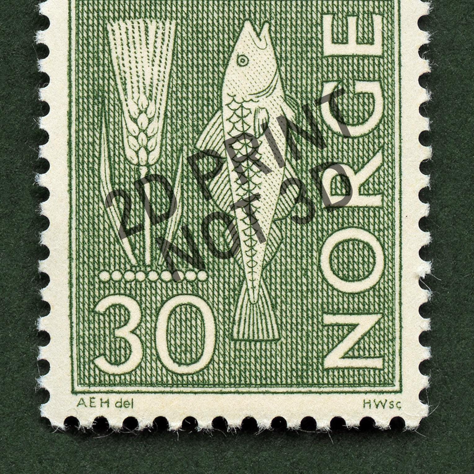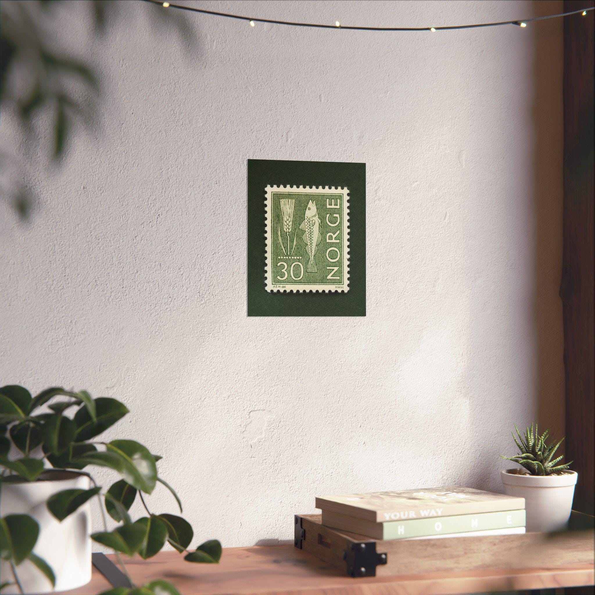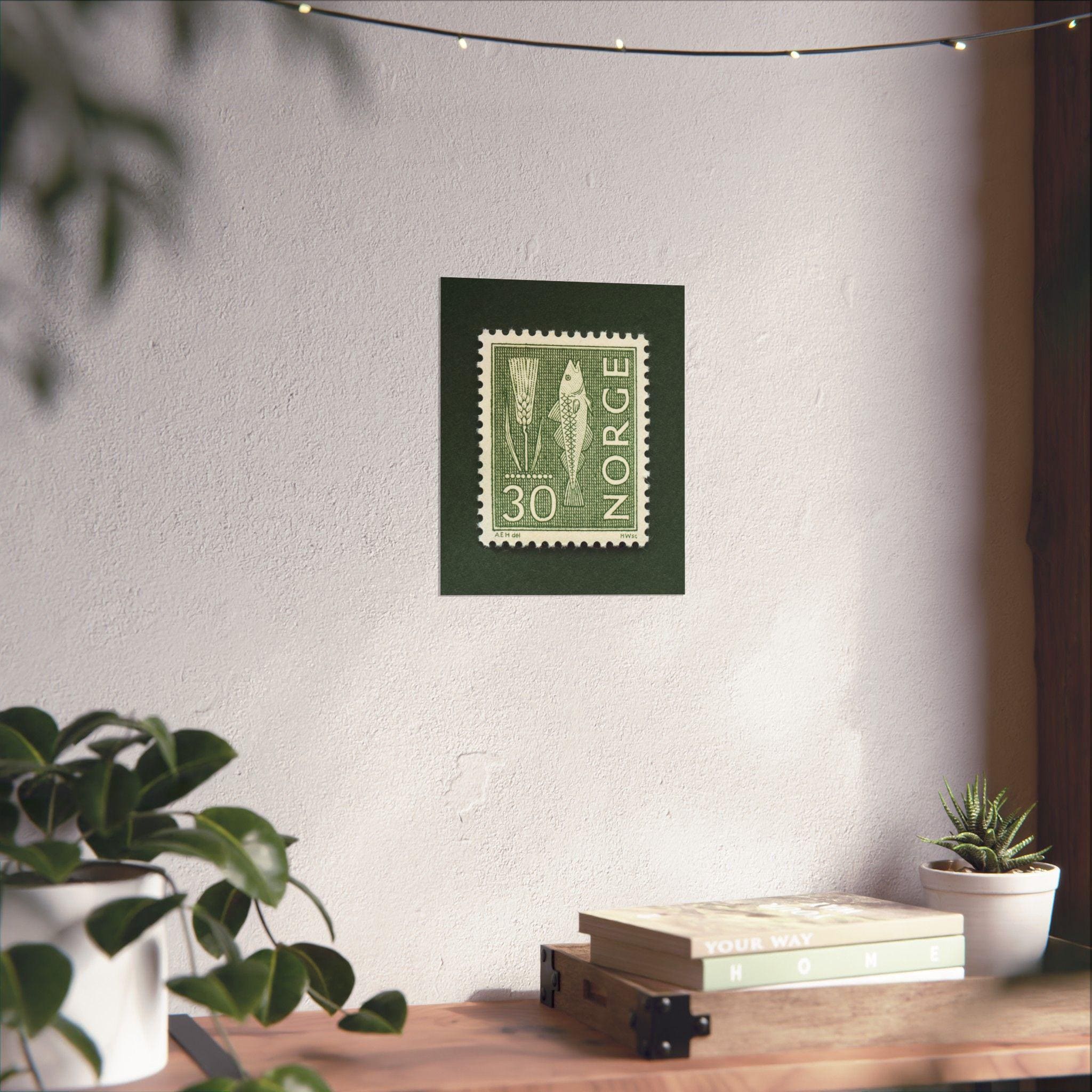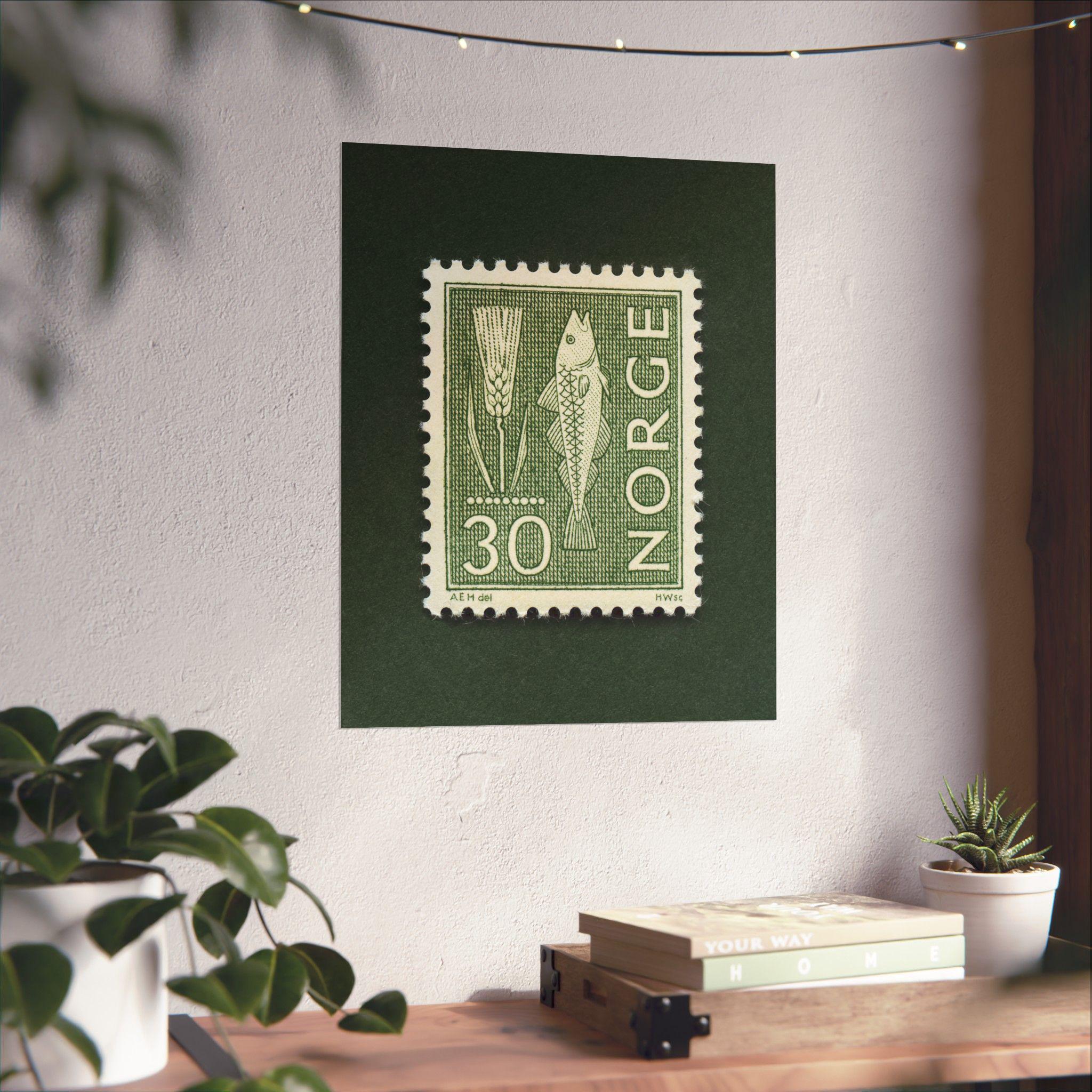 Beautiful monochromatic stamp from Norway featuring a fish and rye. Add a piece of historic Norway with this this thoughtfully crafted vintage stamp art print. Please note, the stamp is one single print with a natural drop shadow as part of the scanning process.
