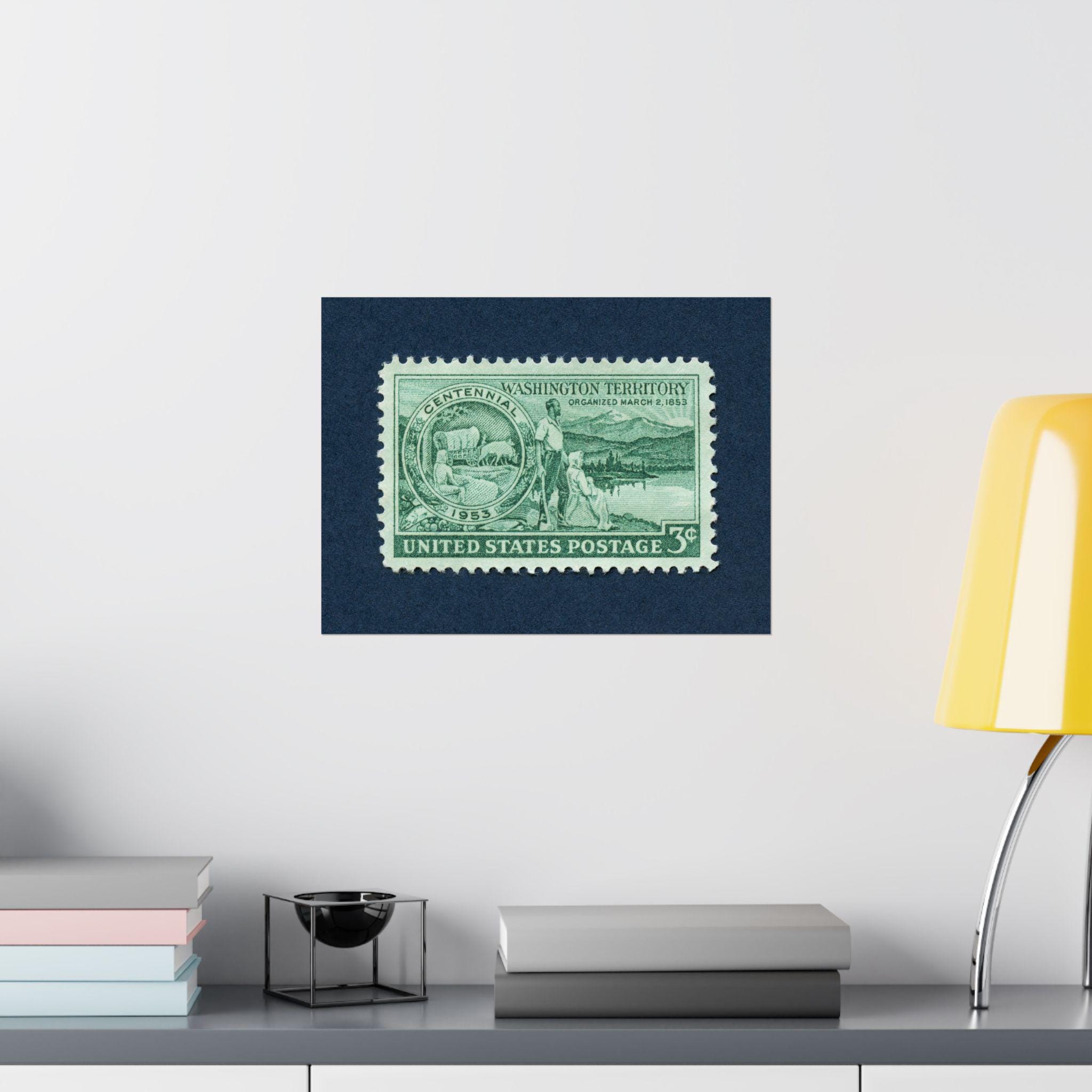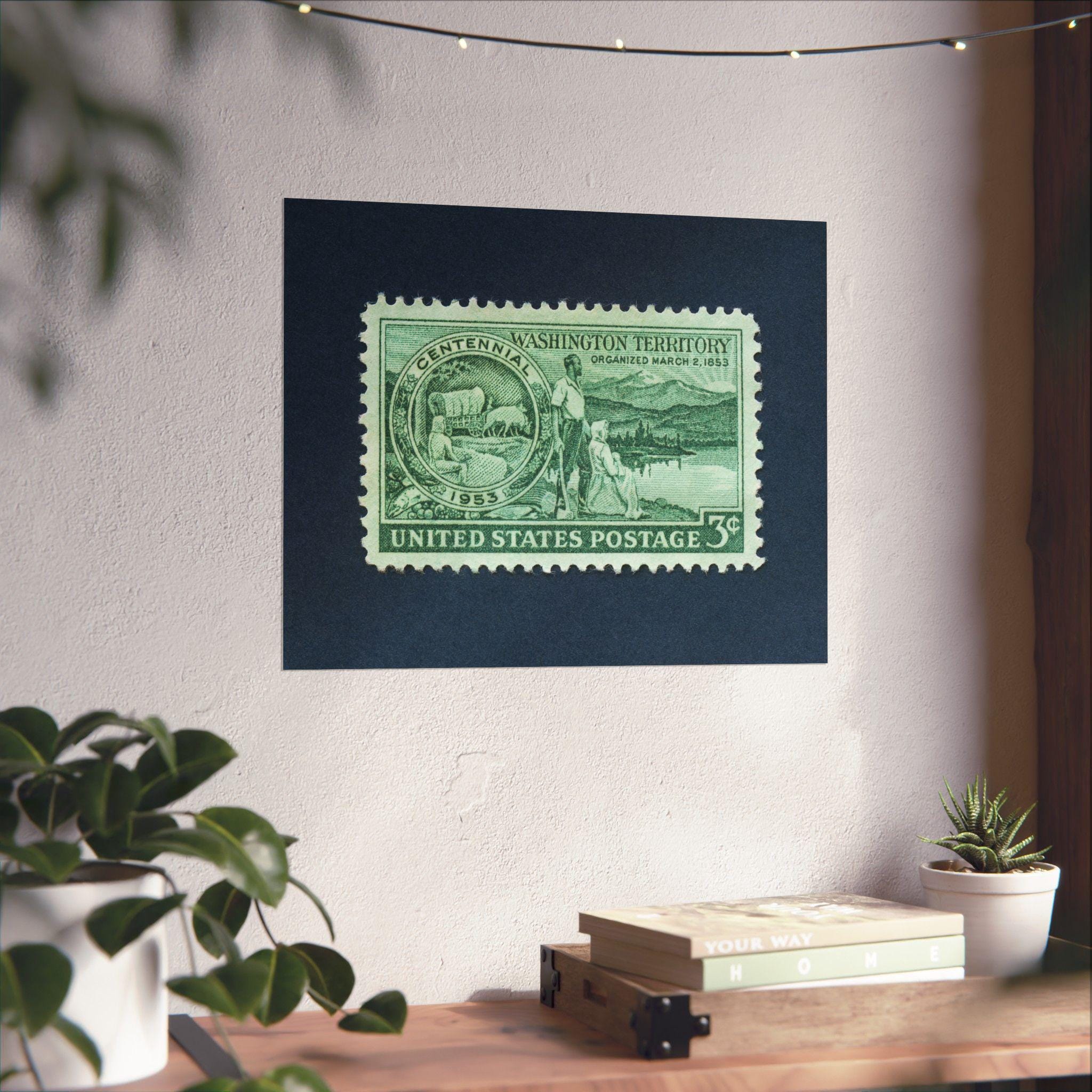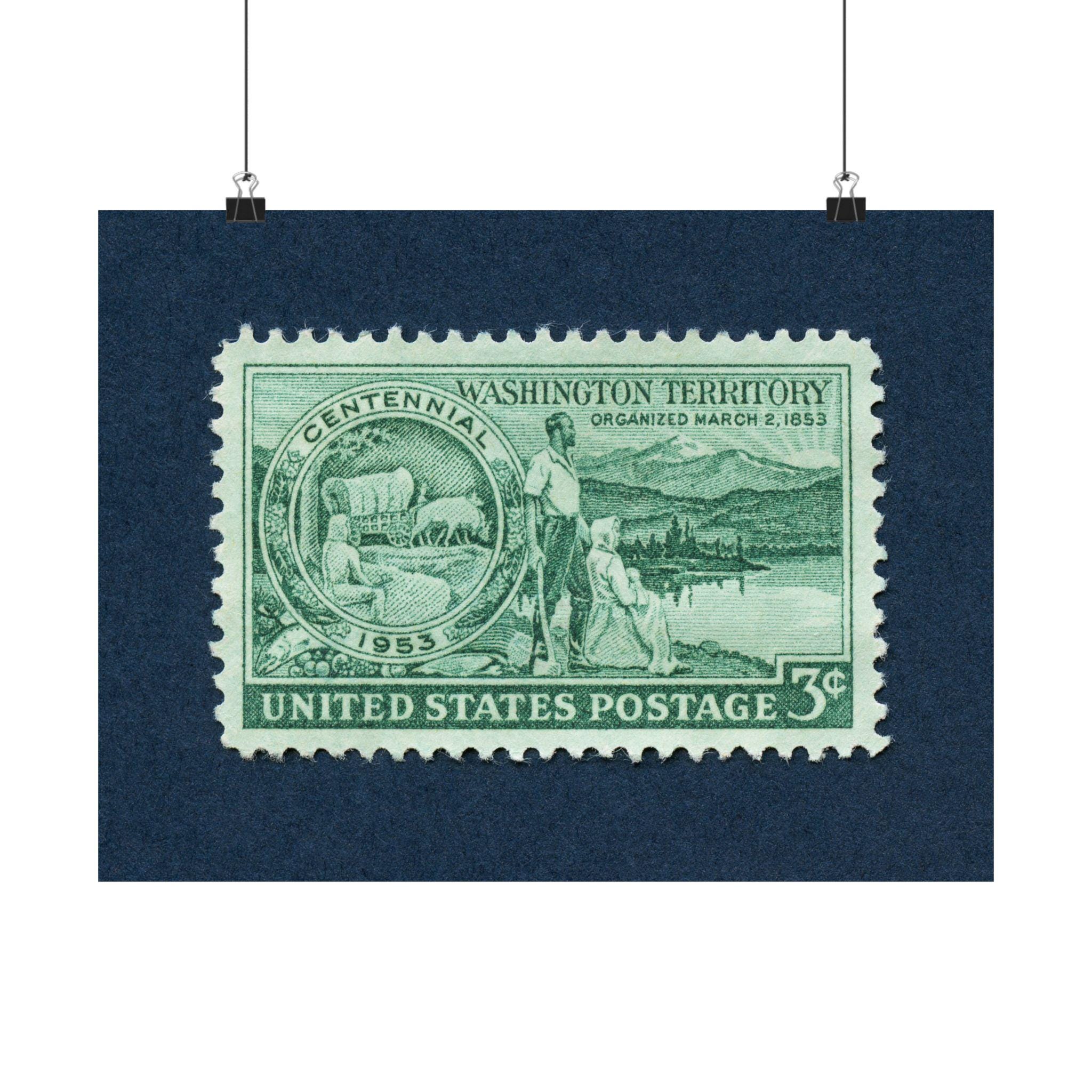 The stamp commemorates the 100th anniversary of the Washington Territory. The stamp pictures early pioneers, a Native American, and the Washington state flower, fruit, and fish. The first recorded European landing on the Washington coast was by Spanish Captain Don Bruno de Heceta in 1775. The area would be considered an official territory of the United States more than 75 years later in 1853. Bring a piece of Washington history into your home or office with this vintage stamp art print.
