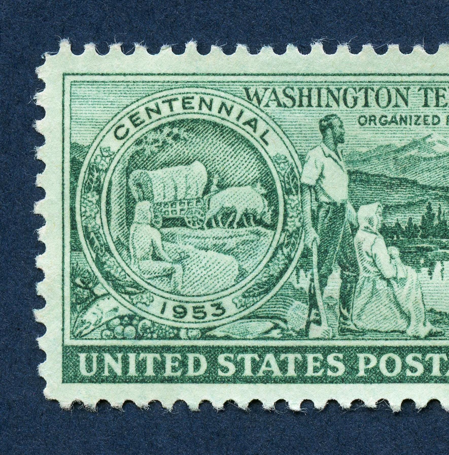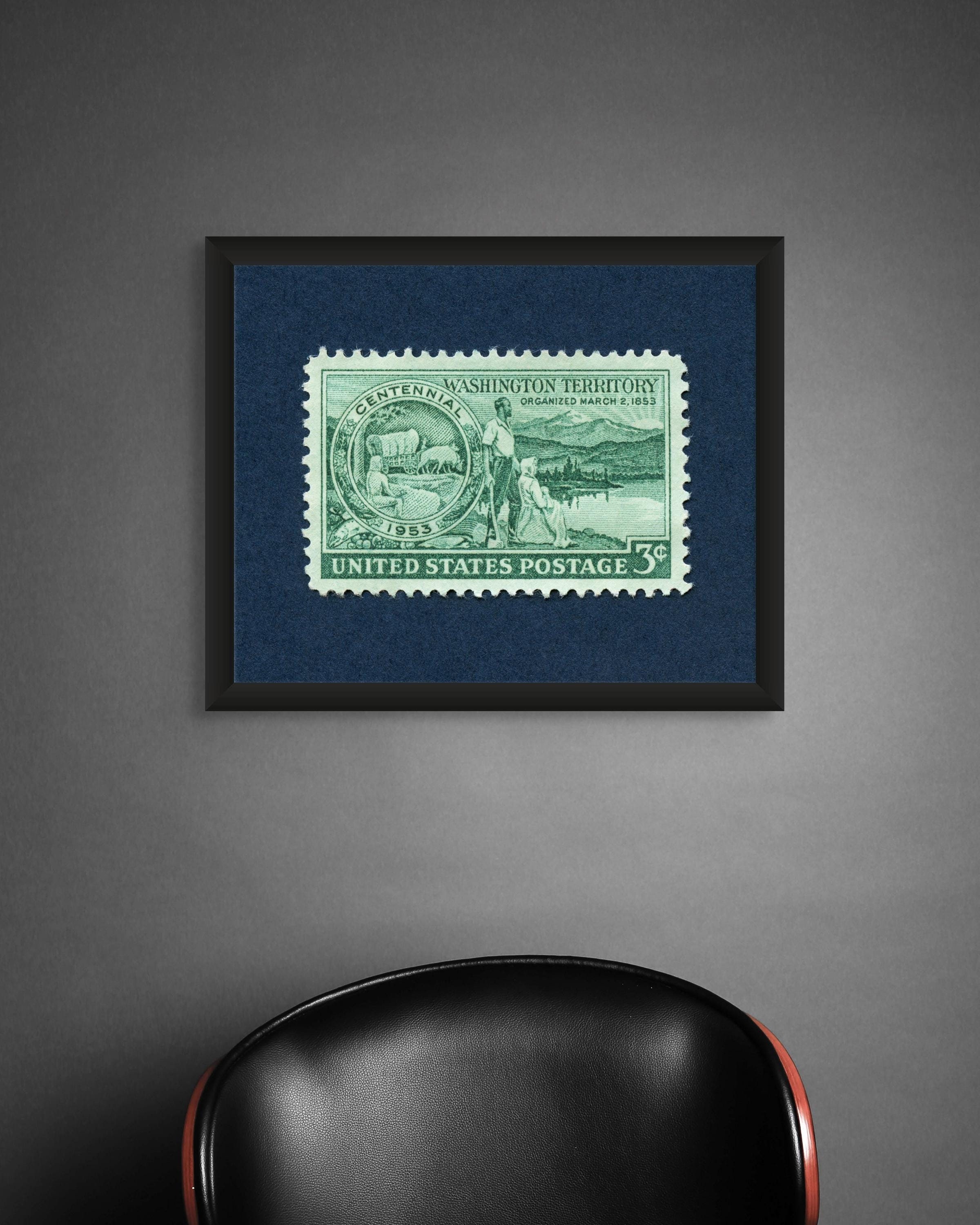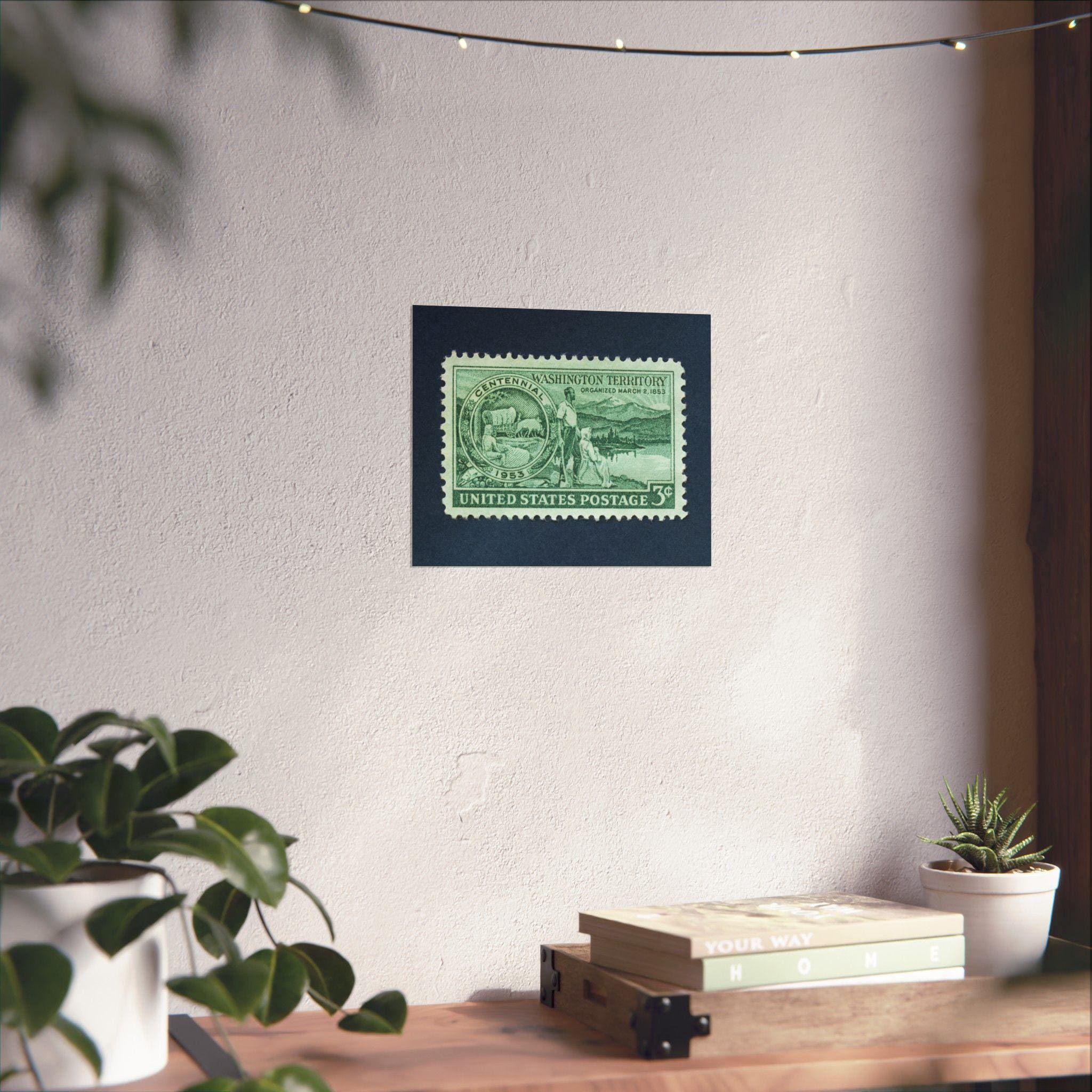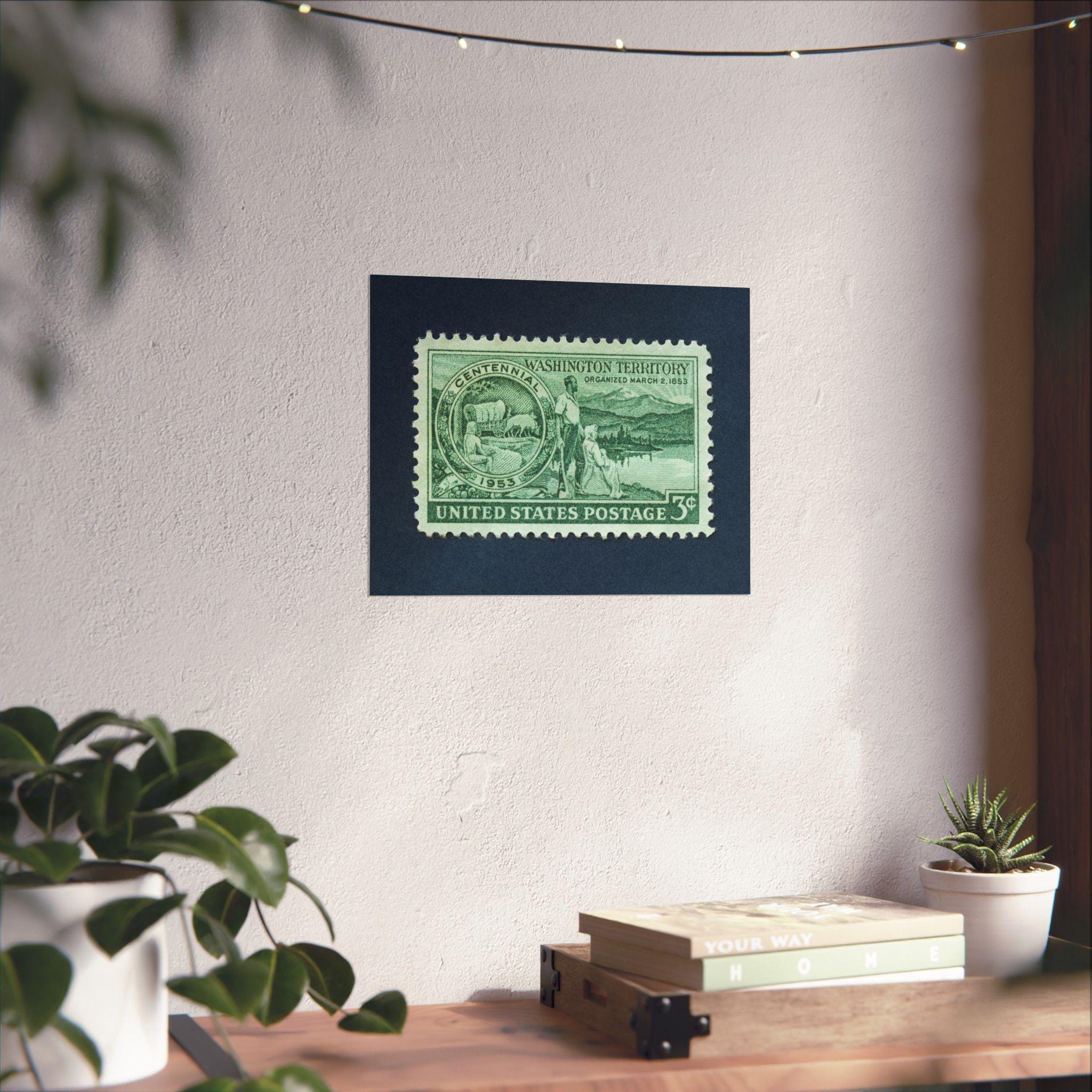 The stamp commemorates the 100th anniversary of the Washington Territory. The stamp pictures early pioneers, a Native American, and the Washington state flower, fruit, and fish. The first recorded European landing on the Washington coast was by Spanish Captain Don Bruno de Heceta in 1775. The area would be considered an official territory of the United States more than 75 years later in 1853. Bring a piece of Washington history into your home or office with this vintage stamp art print.