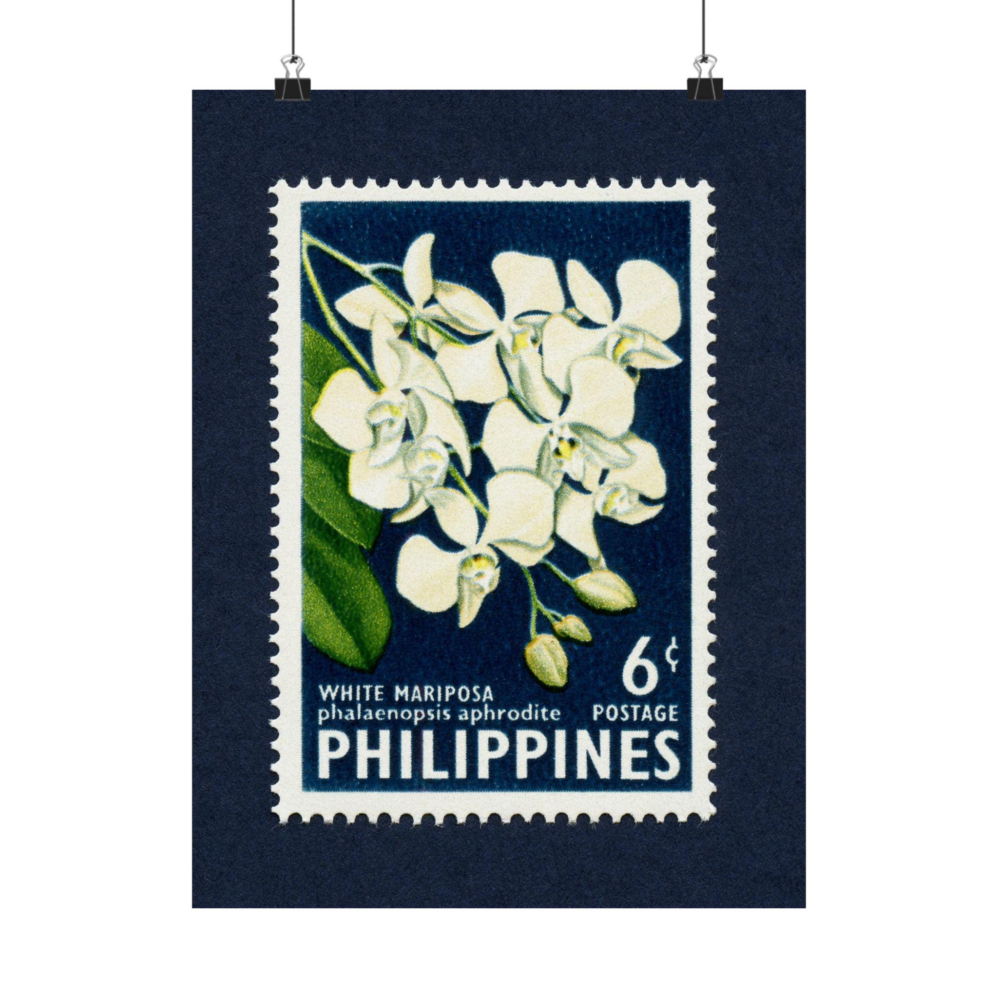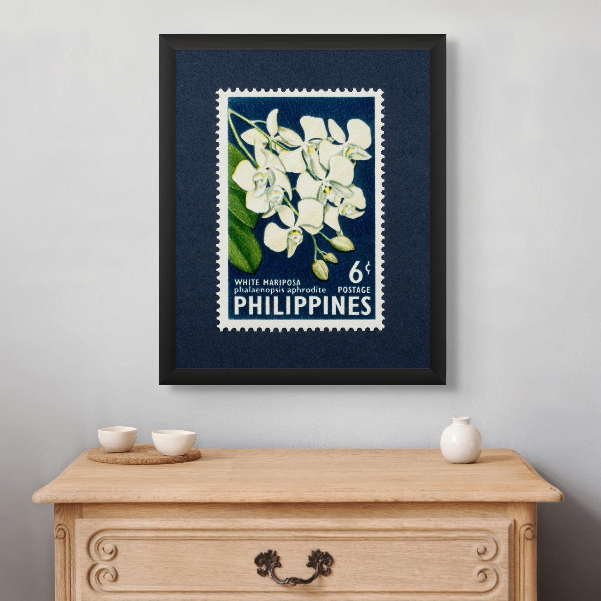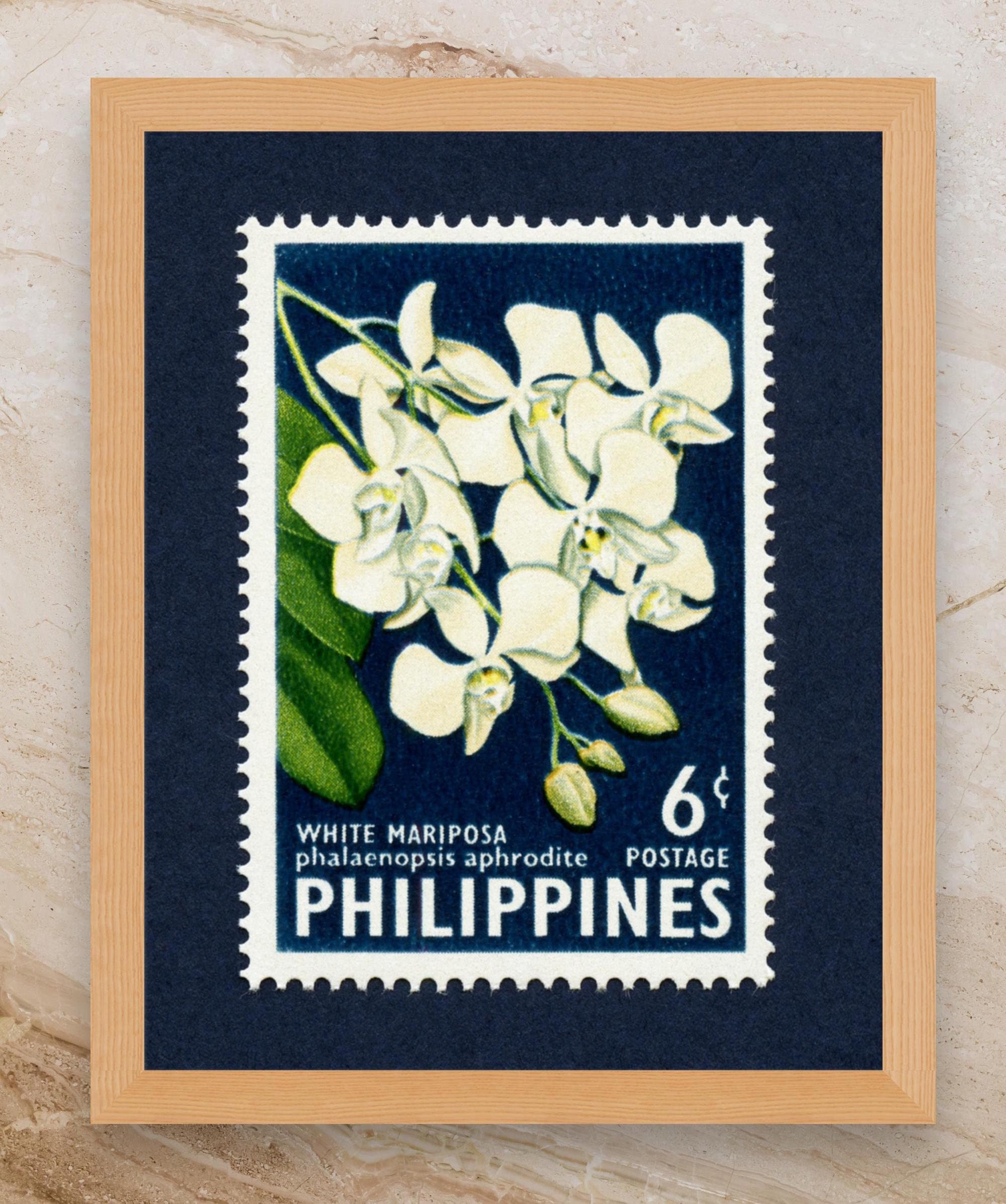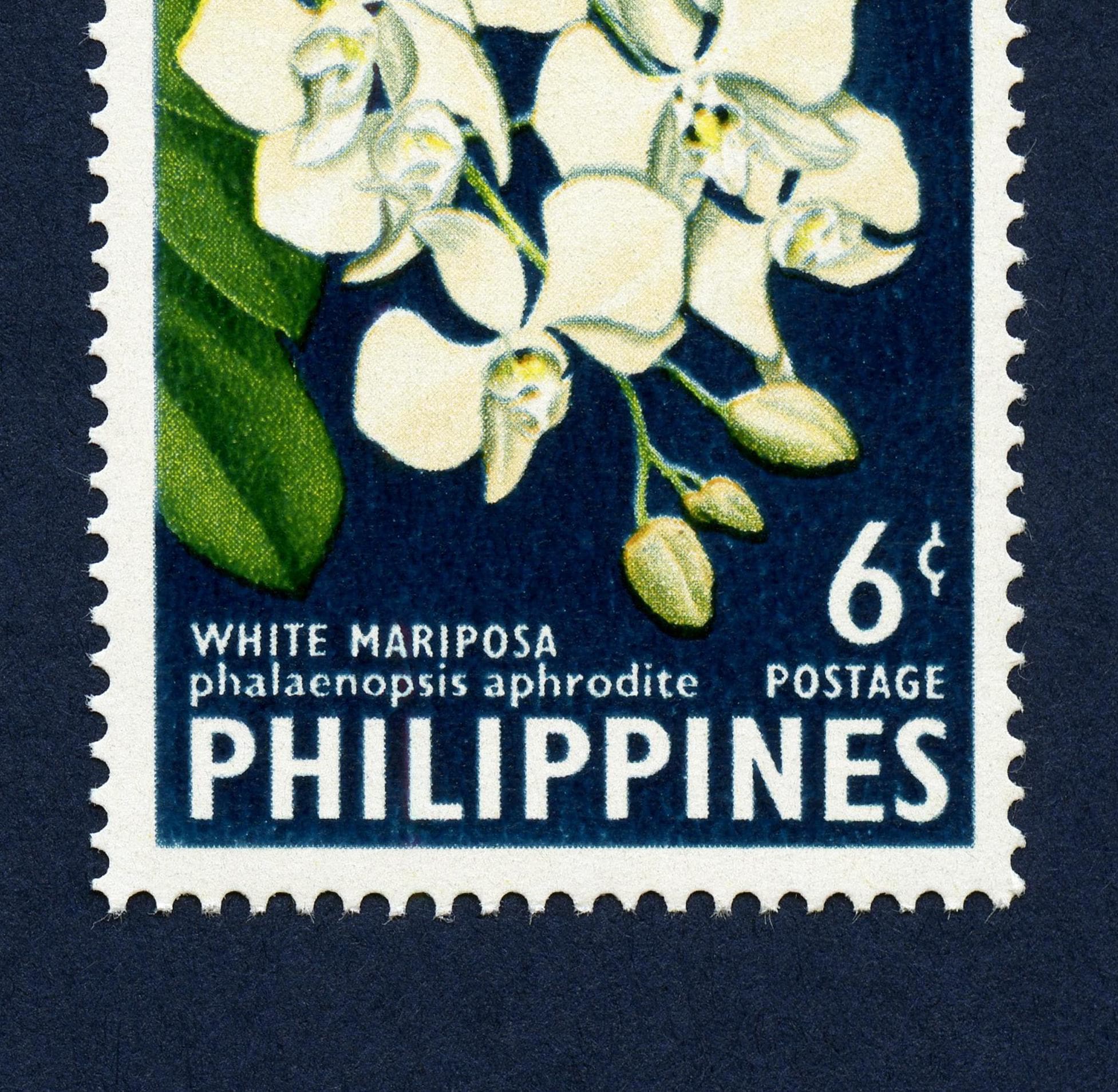 Beautiful botanical style illustration from a vintage Philippines stamp. Released in 1962 as part of a series of 4 different species of orchids, this stamp features the White Mariposa Orchid.