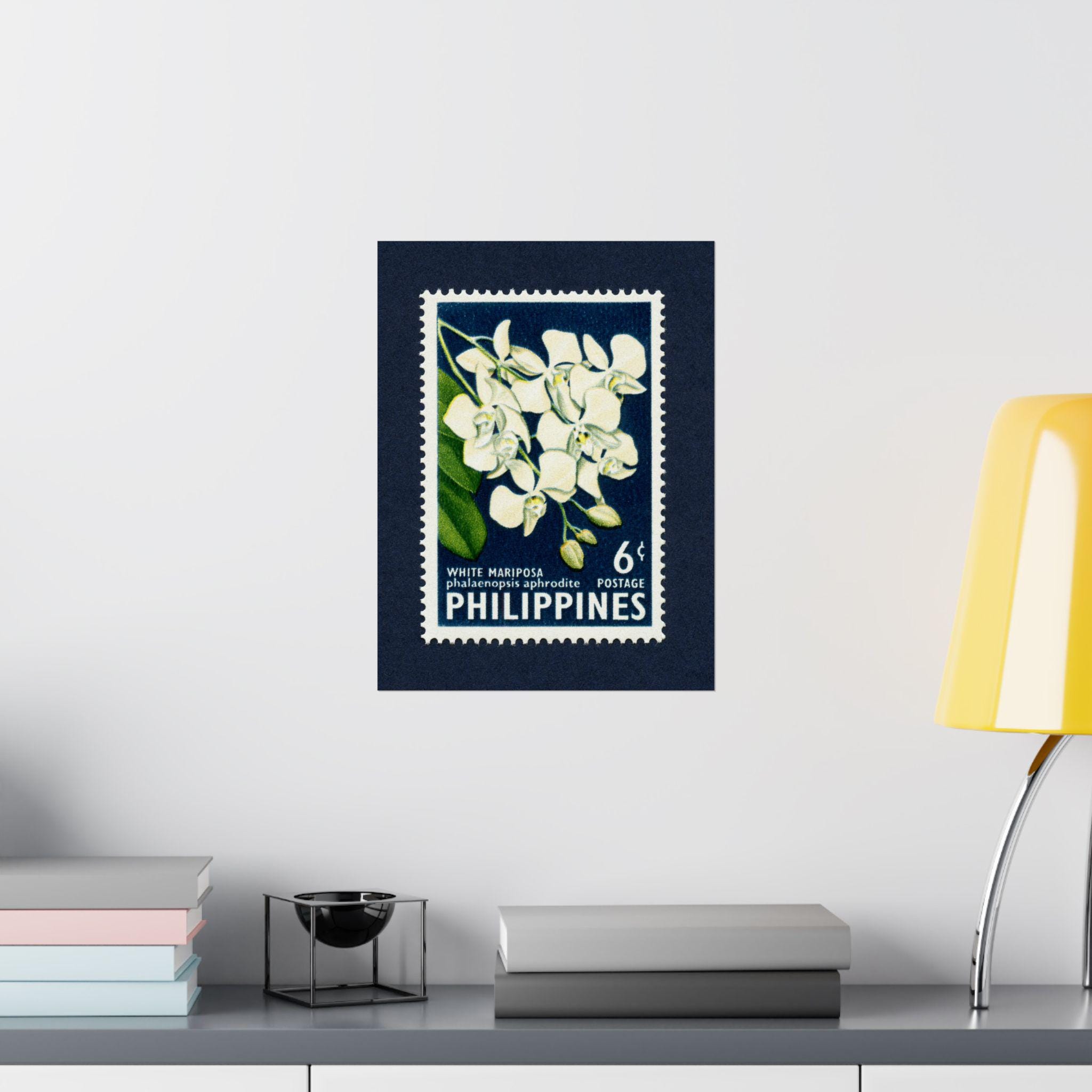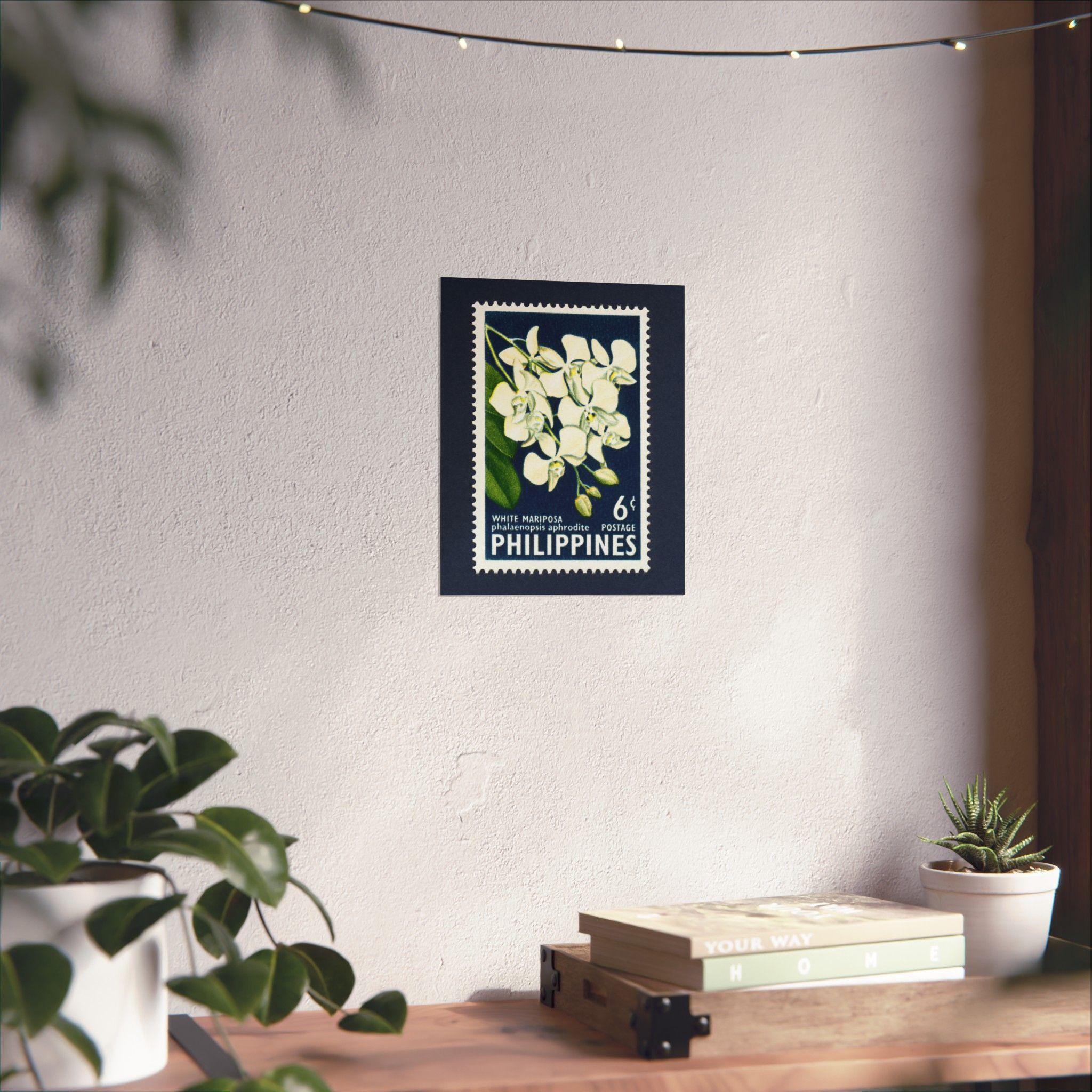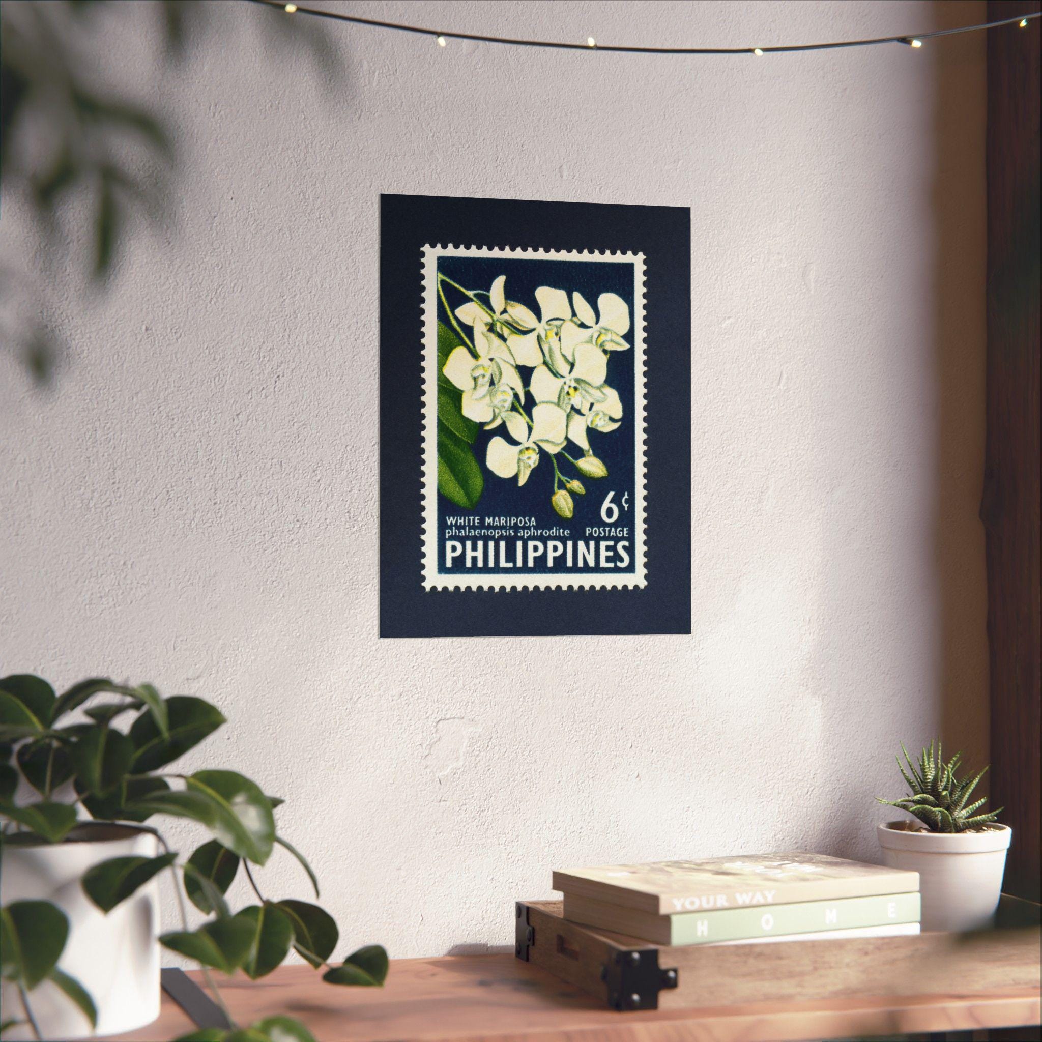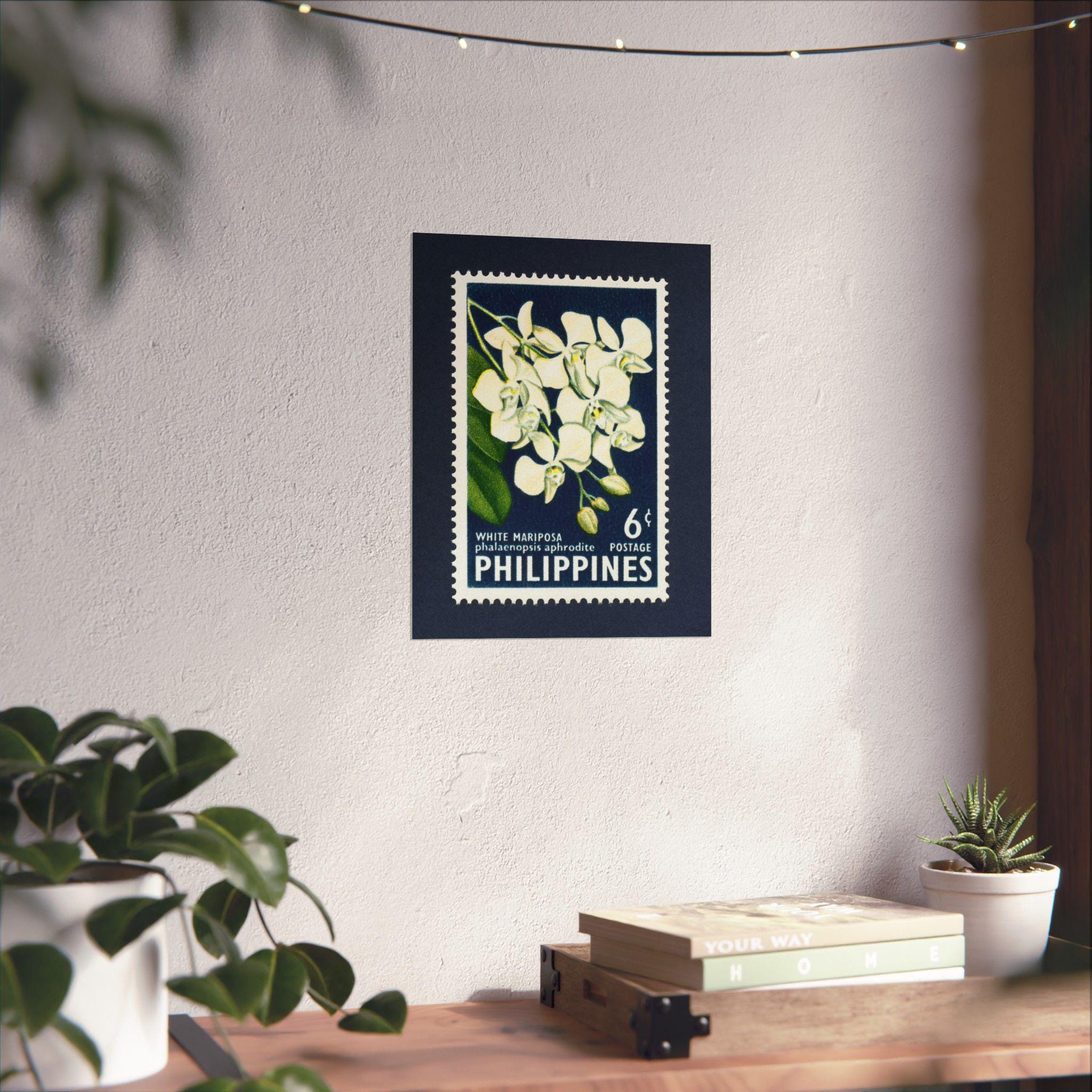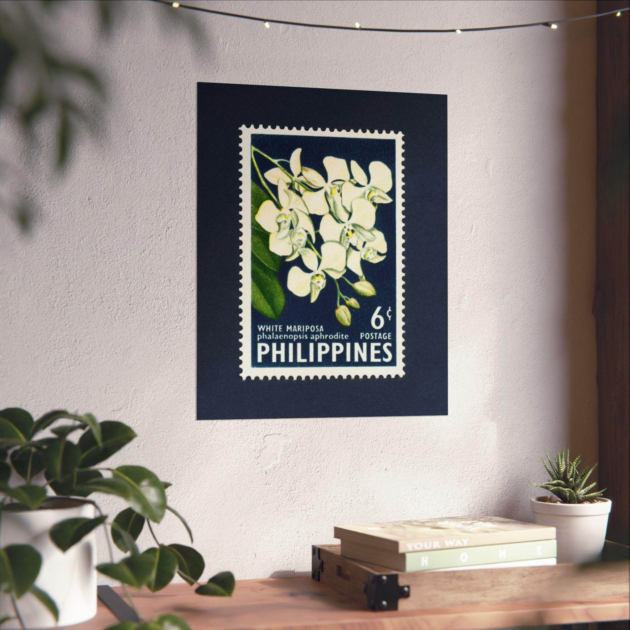 Beautiful botanical style illustration from a vintage Philippines stamp. Released in 1962 as part of a series of 4 different species of orchids, this stamp features the White Mariposa Orchid.