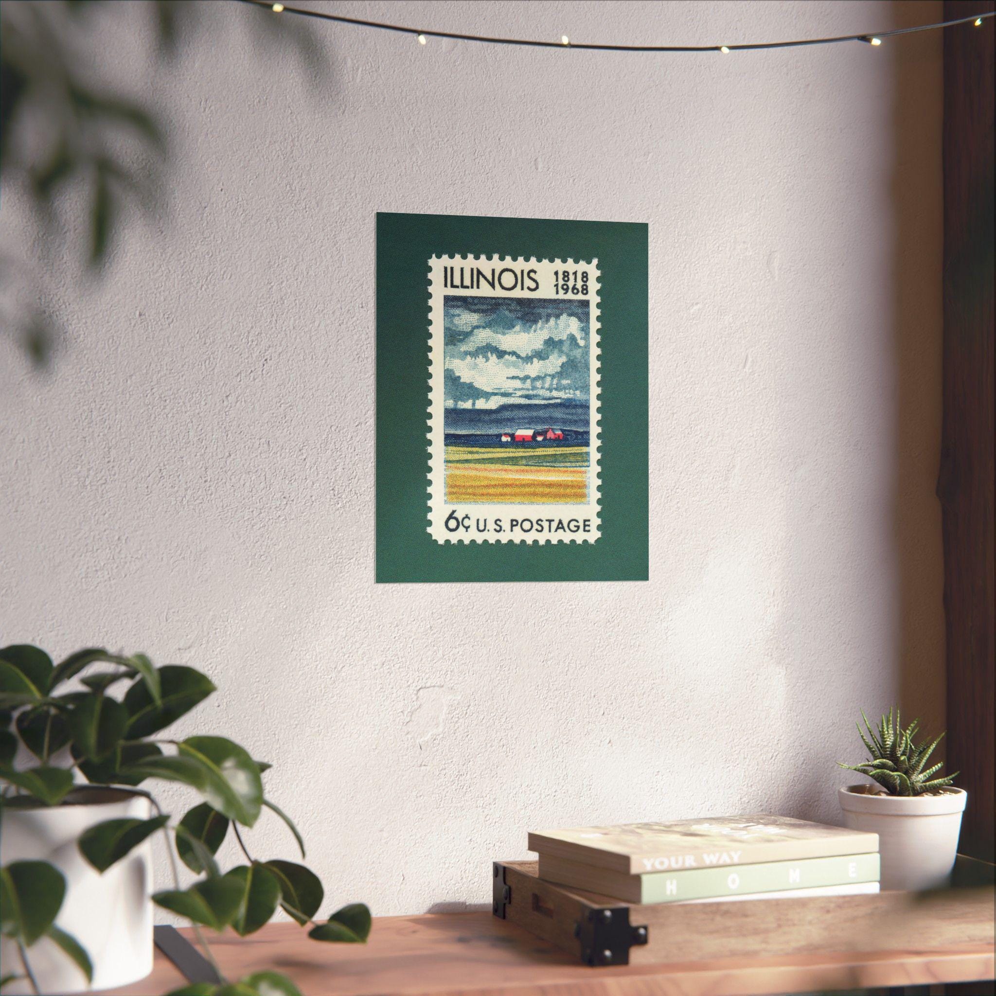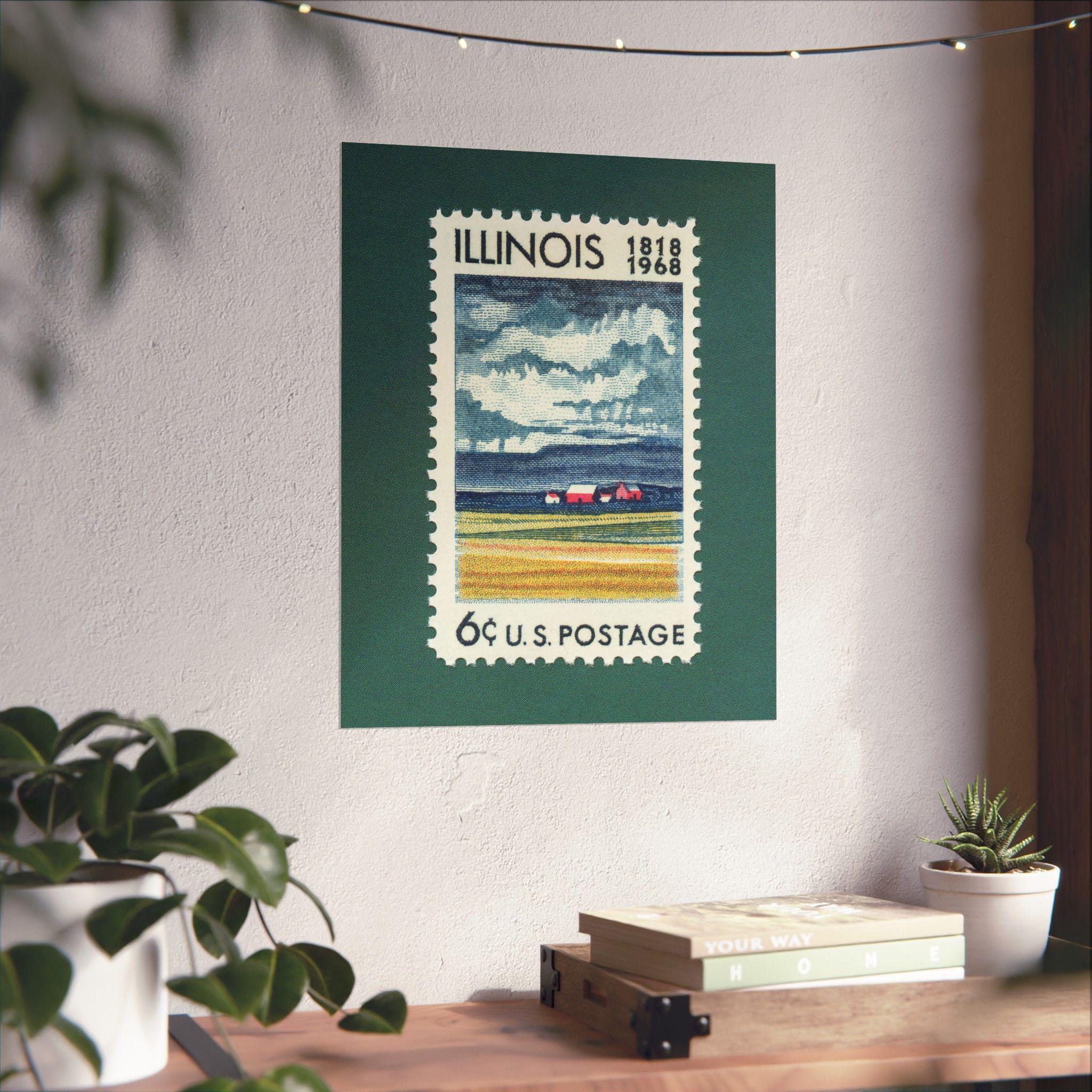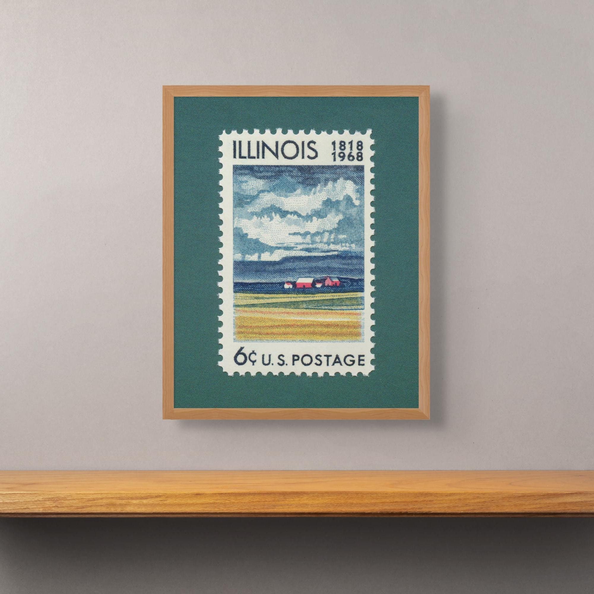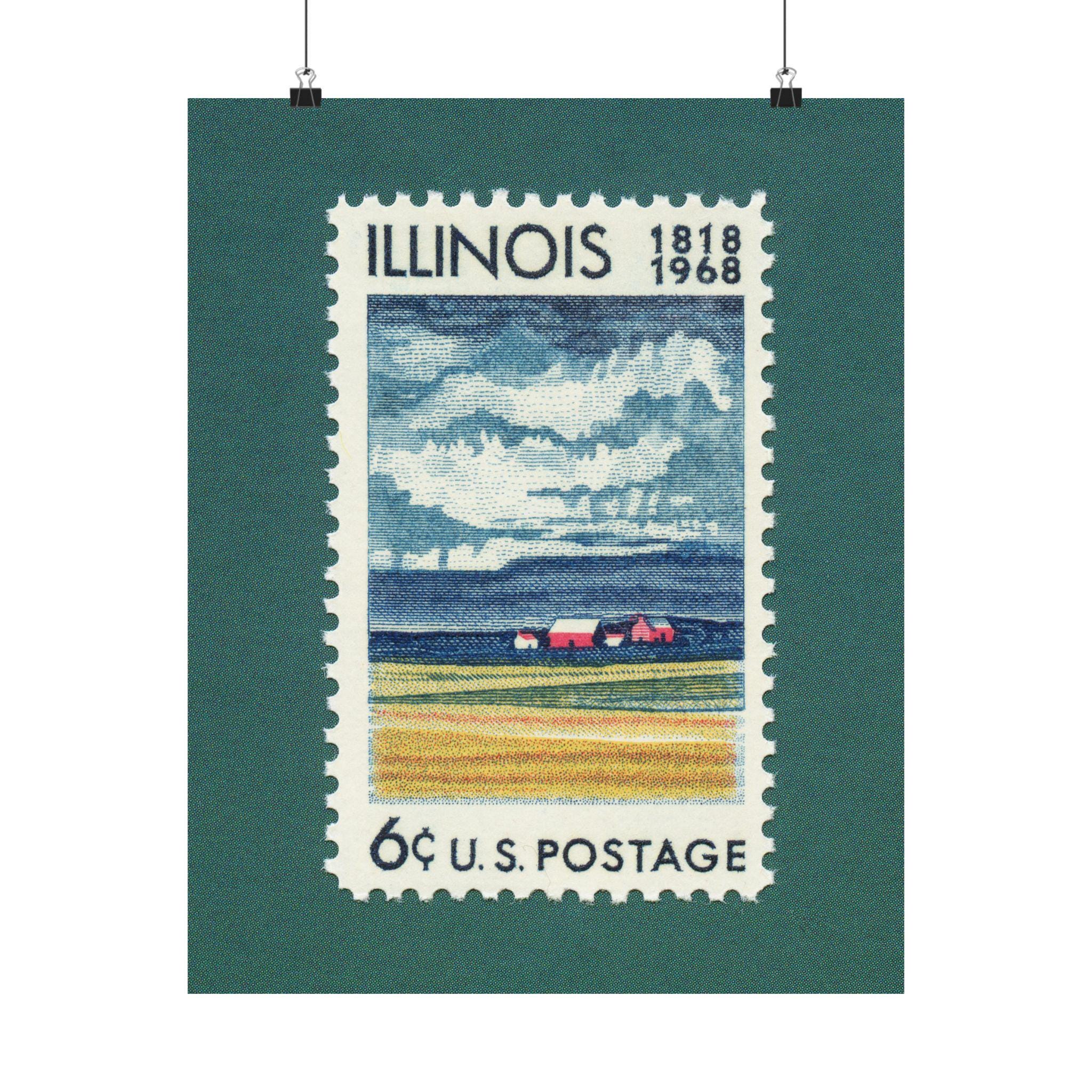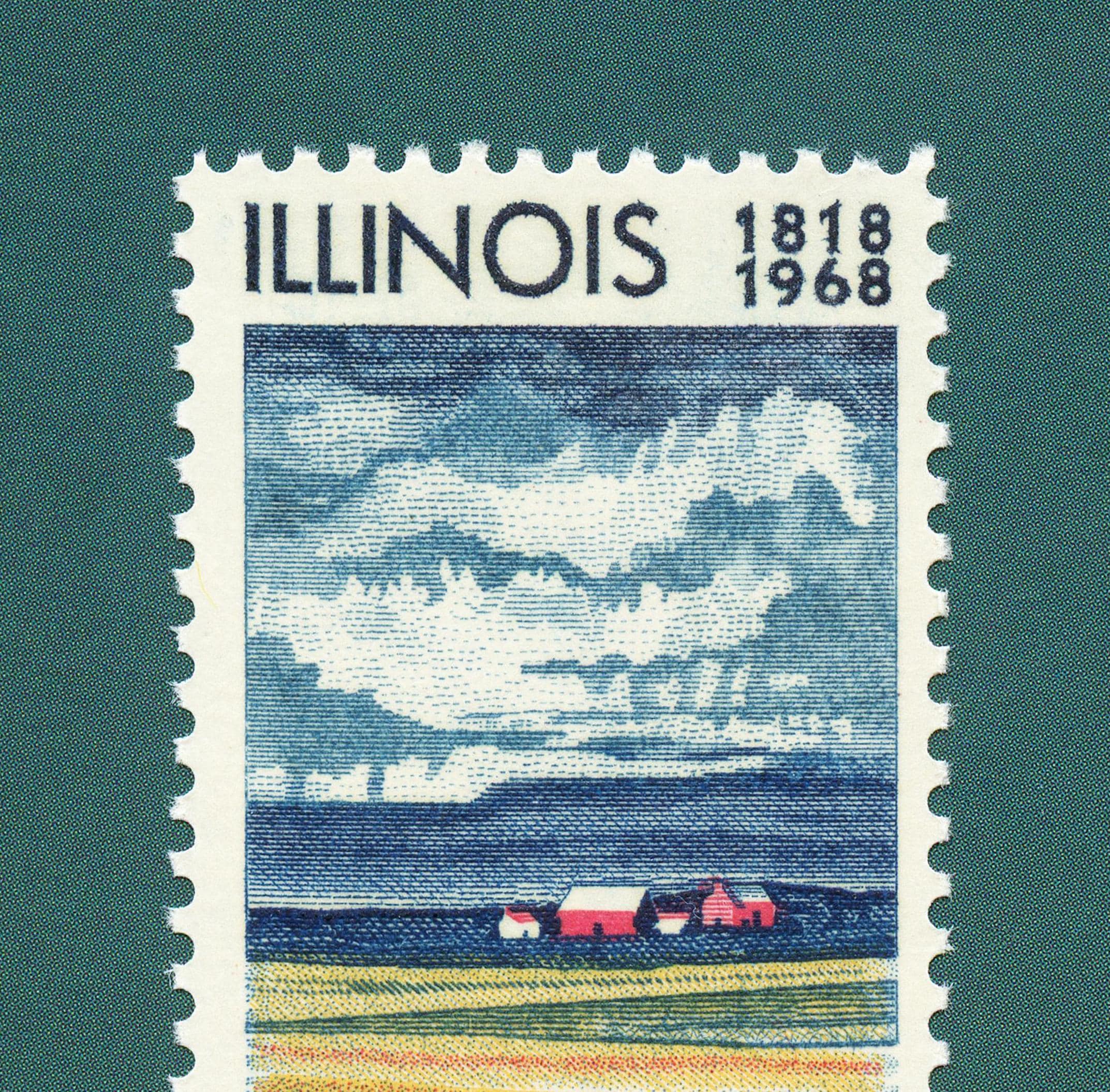 Commemorating 150 years of the great state of Illinois, this stamp was issued in 1968 and features a pastoral farm scene and moody clouds in the distance. Add a piece of Americana nostalgia to your home or office with this museum-grade art print.