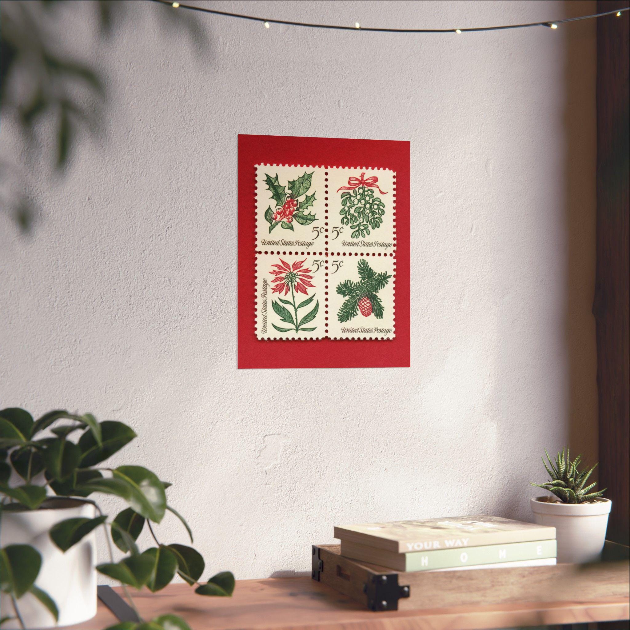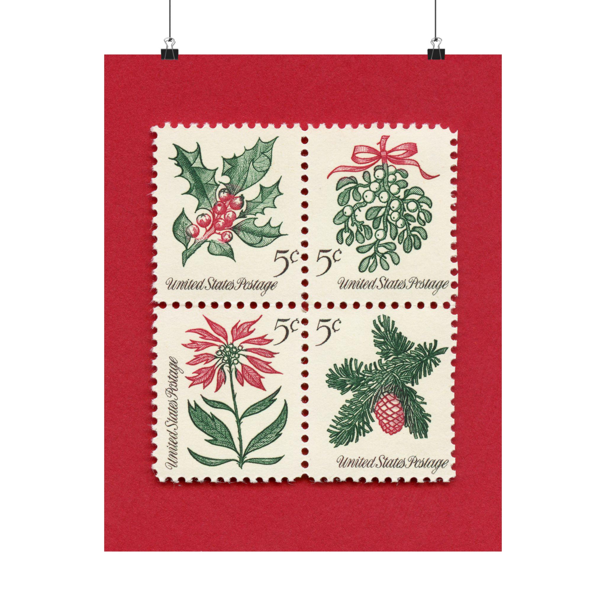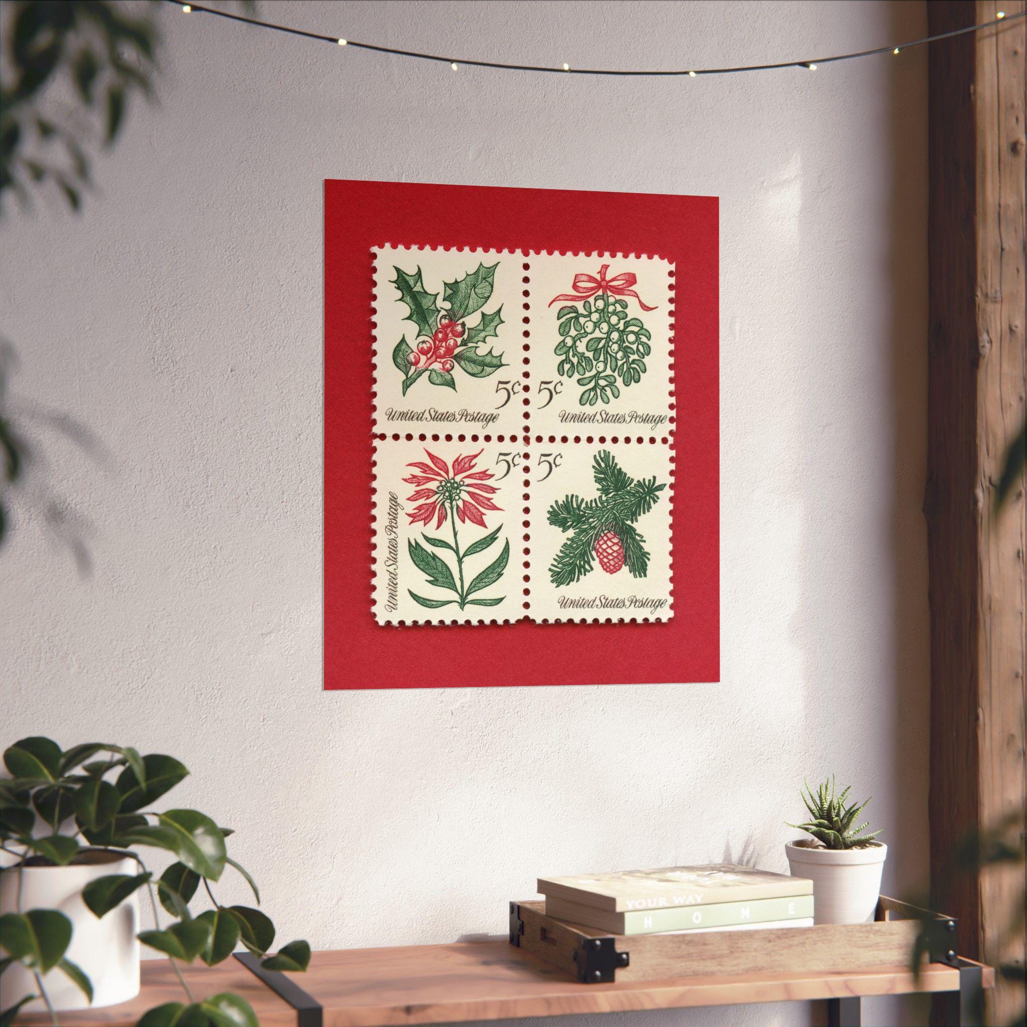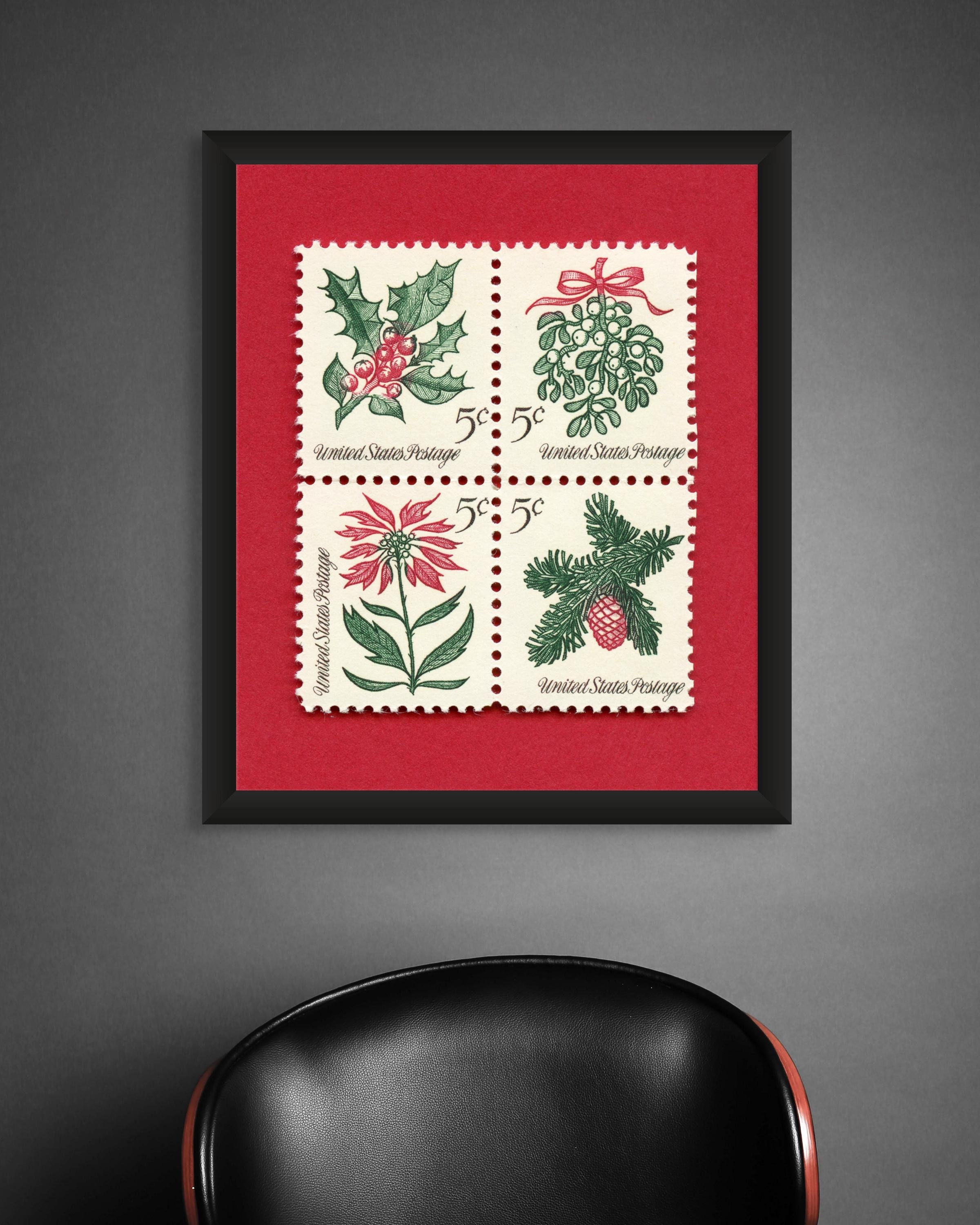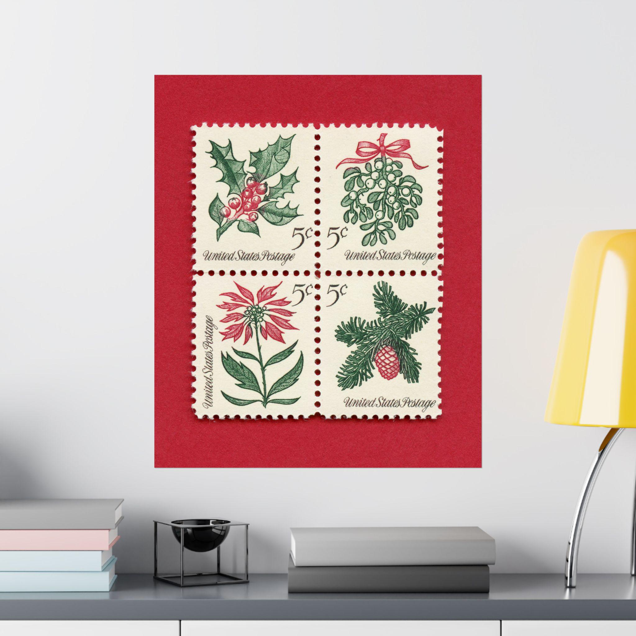 This U.S. Christmas issue was unique because it was the first time the Post Office had printed more than one stamp design on one sheet. This set was released in 1964, and was the third ever Christmas stamp ever offered. Add a piece of of history from a bygone era to your home or office with this carefully crafted vintage stamp art print. Please note, the print is one single 2D piece, with a natural drop shadow from the scanning process.