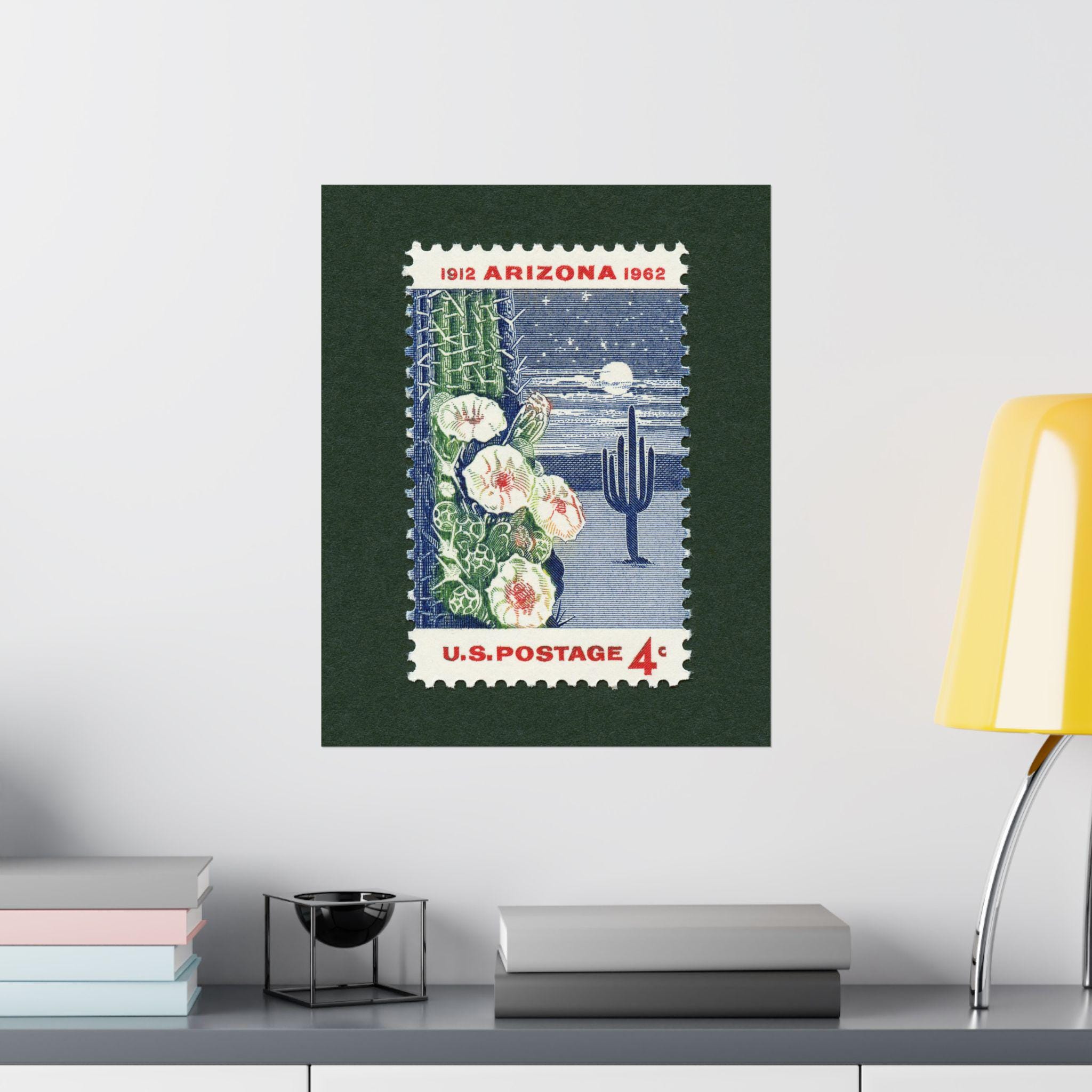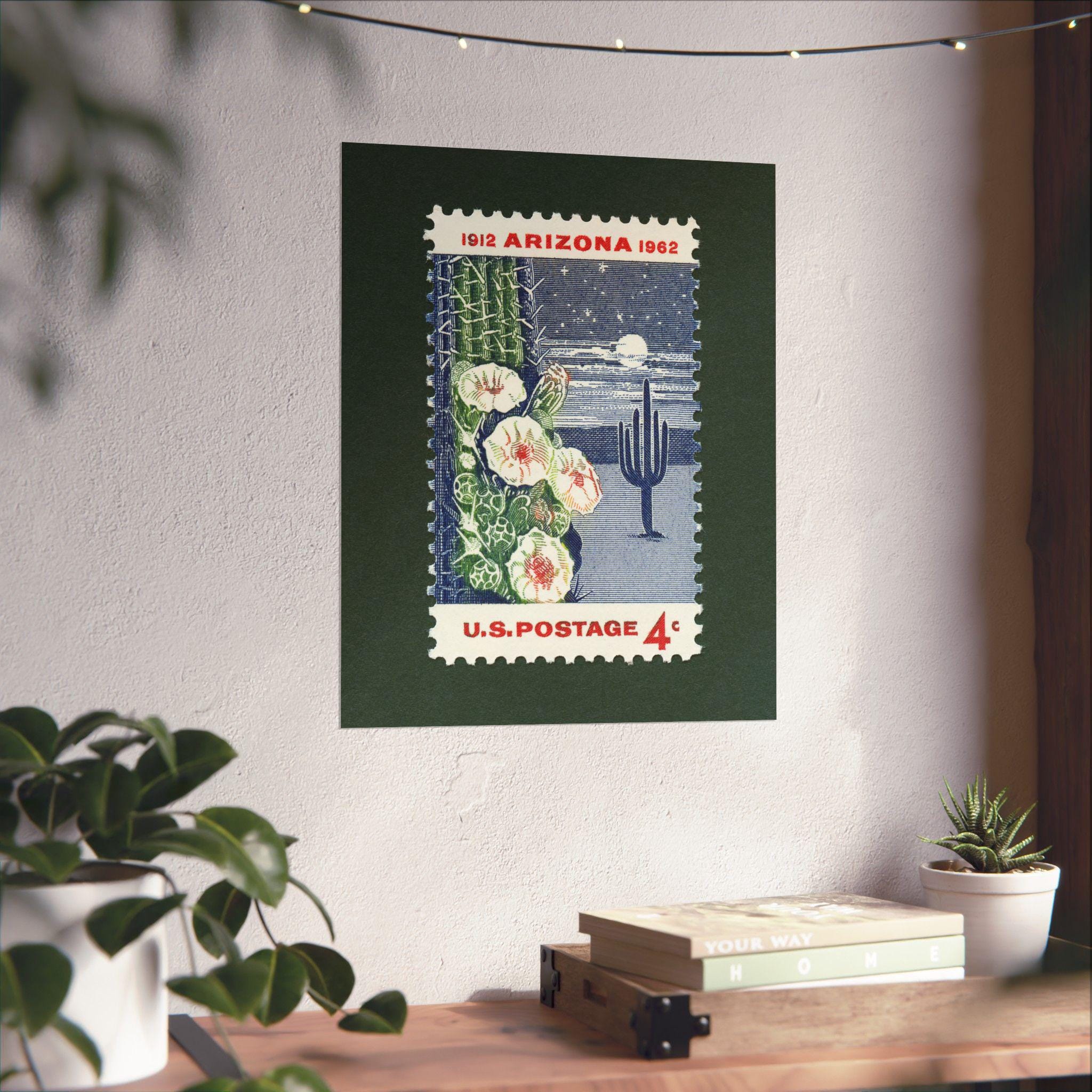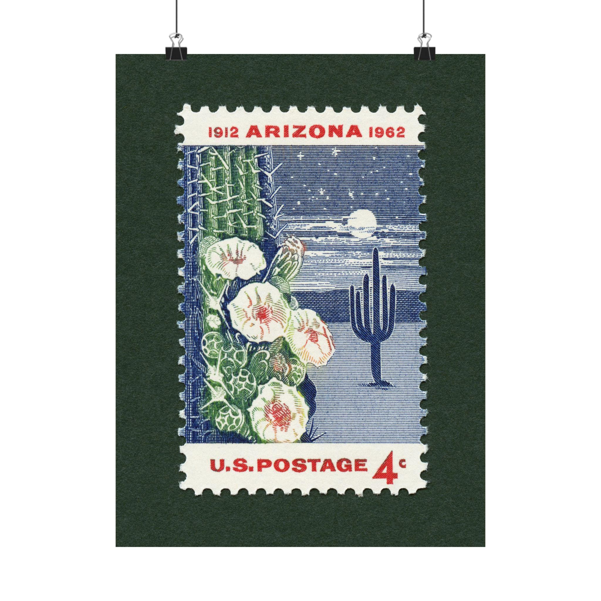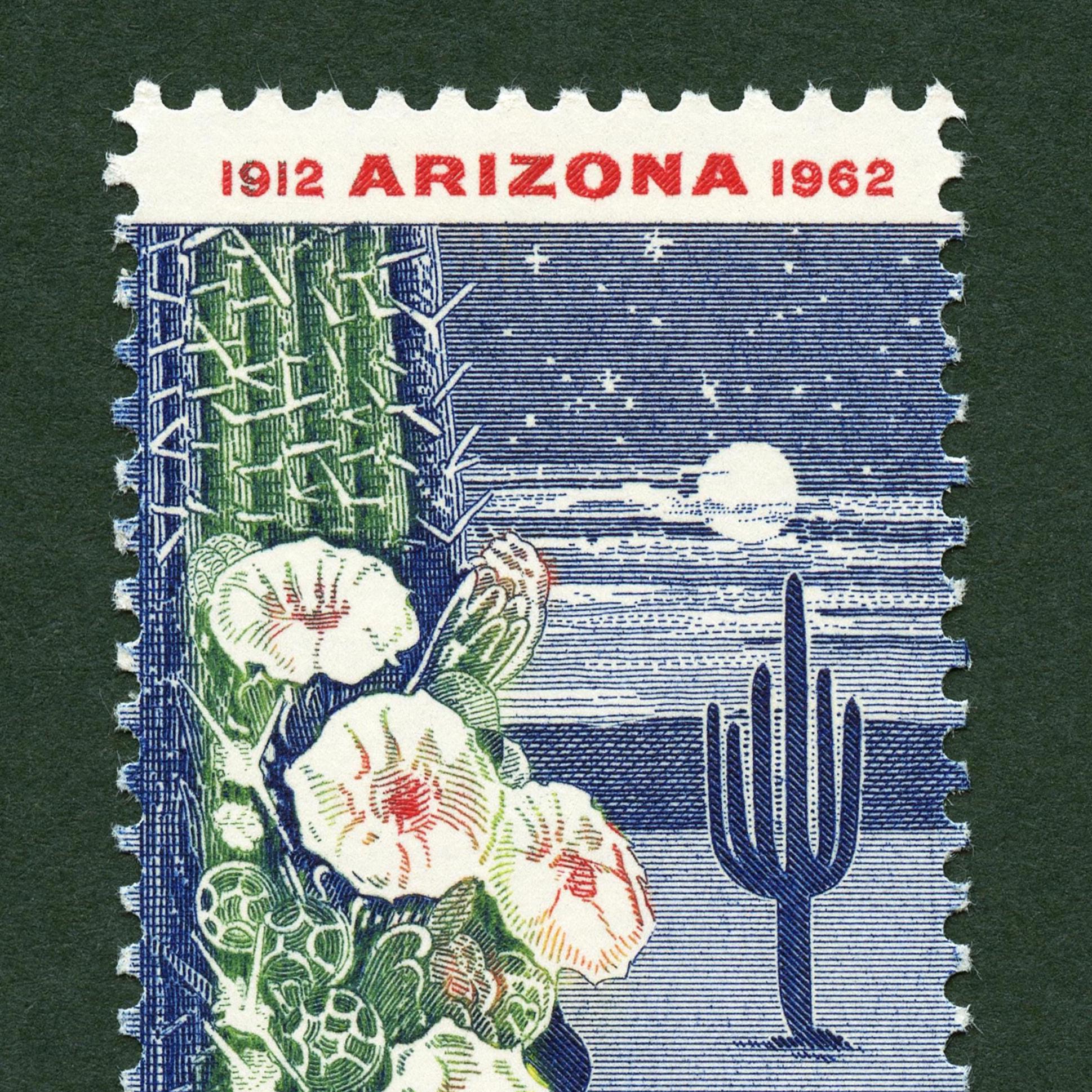 Celebrating the 50th anniversary of Arizona’s addition as the 48th U.S. state, this stamp depicts a moonlit saguaro cactus in bloom, the state flower of Arizona. The stamp, released in 1962 is now over 60 years old.